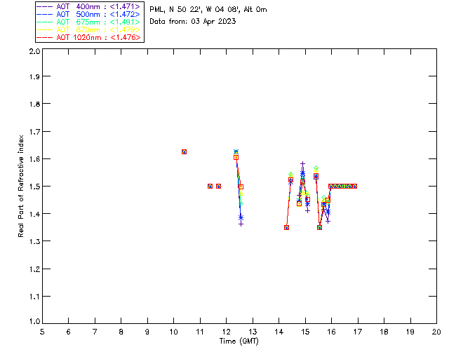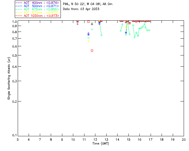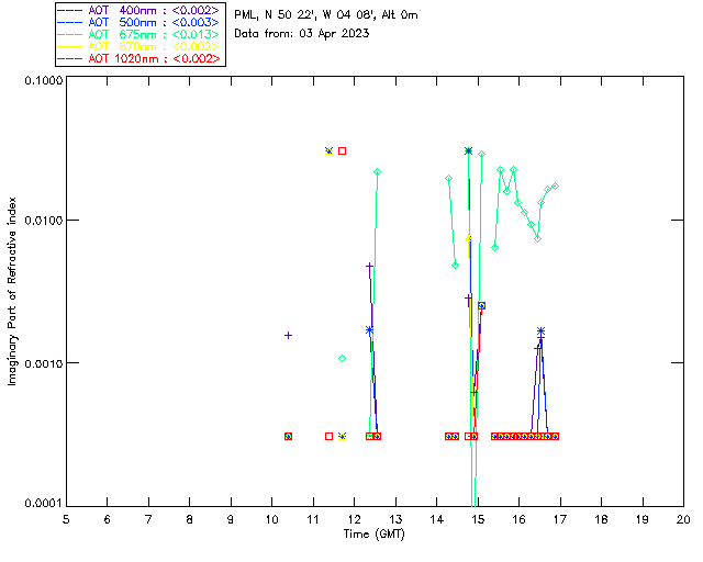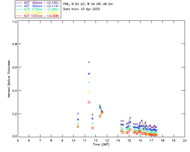In May 2001 a PREDE POM01-L was installed on the roof of the Plymouth Marine Laboratory to continue the atmospheric correction research of the PML Remote Sensing Group. This was to replace the AERONET CIMEL sunphotometer situated at Rame Head which was decommissioned in 1999. The instrument operates at 7 wavelengths (315, 400, 500, 670, 870, 940 and 1020nm) and scans at pre-set angles away from the solar disk to determine, using the inversion code of Nakajima et al. (2006), various properties of tiny particles called aerosols within the atmospheric column. From these measurements useful atmospheric aerosol parameters such as the Aerosol Optical Thickness (AOT), aerosol size distribution and single scattering albedo can be calculated. Marine aerosols tend to be bigger (D > 1µm) than those generated over the land (0.01 < D < 1µm) and are of a different chemical composition; marine aerosols are salt particles whereas terrestrial aerosols are sulphate compounds.