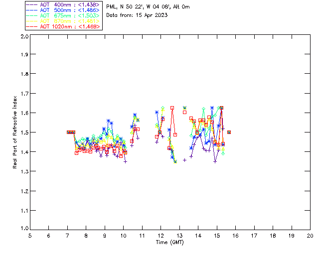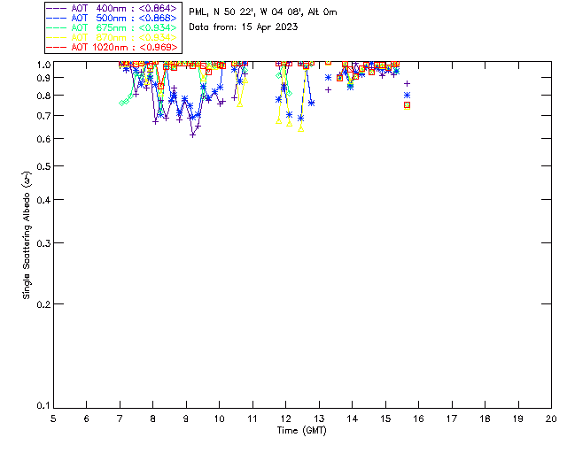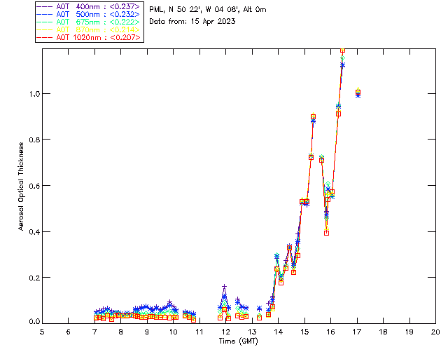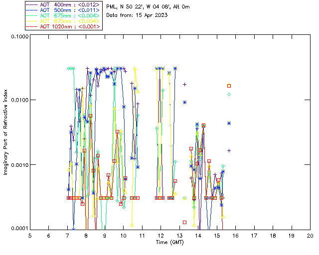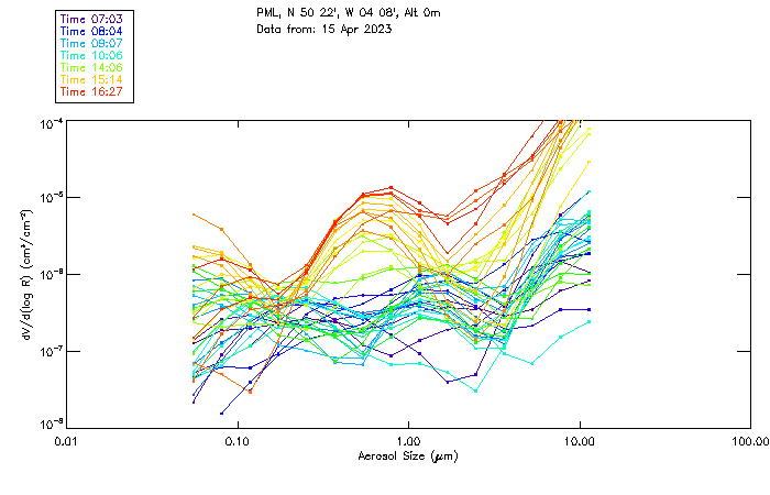 In May 2001 a PREDE POM01-L was installed on the roof of the Plymouth Marine Laboratory to continue the atmospheric correction research of the PML Remote Sensing Group. This was to replace the AERONET CIMEL sunphotometer situated at Rame Head which was decommissioned in 1999. The instrument operates at 7 wavelengths (315, 400, 500, 670, 870, 940 and 1020nm) and scans at pre-set angles away from the solar disk to determine, using the inversion code of Nakajima et al. (2006), various properties of tiny particles called aerosols within the atmospheric column. From these measurements useful atmospheric aerosol parameters such as the Aerosol Optical Thickness (AOT), aerosol size distribution and single scattering albedo can be calculated. Marine aerosols tend to be bigger (D > 1µm) than those generated over the land (0.01 < D < 1µm) and are of a different chemical composition; marine aerosols are salt particles whereas terrestrial aerosols are sulphate compounds.