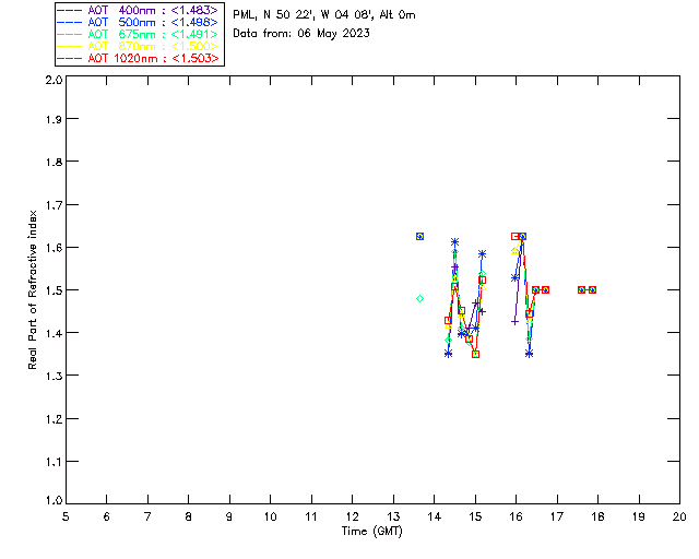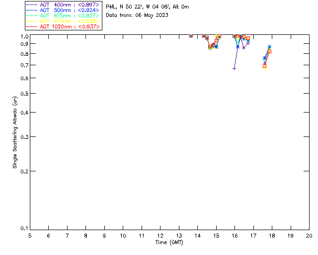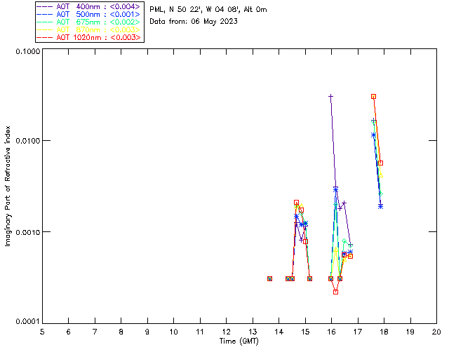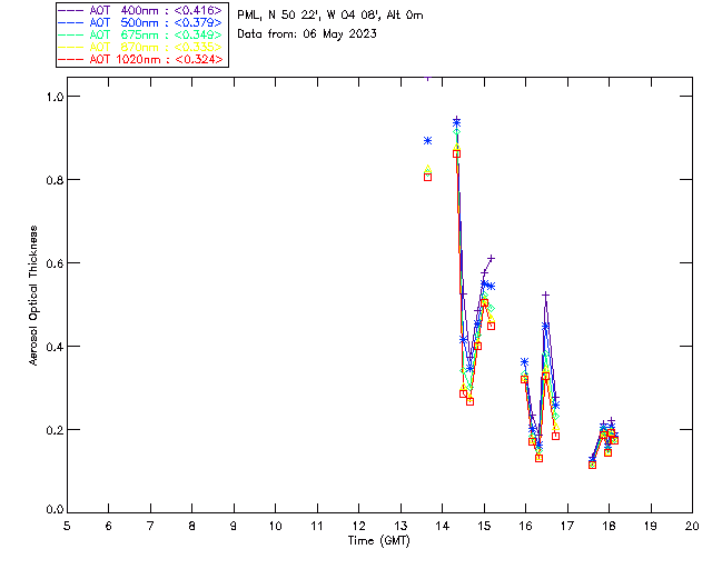 In May 2001 a PREDE POM01-L was installed on the roof of the Plymouth Marine Laboratory to continue the atmospheric correction research of the PML Remote Sensing Group. This was to replace the AERONET CIMEL sunphotometer situated at Rame Head which was decommissioned in 1999. The instrument operates at 7 wavelengths (315, 400, 500, 670, 870, 940 and 1020nm) and scans at pre-set angles away from the solar disk to determine, using the inversion code of Nakajima et al. (2006), various properties of tiny particles called aerosols within the atmospheric column. From these measurements useful atmospheric aerosol parameters such as the Aerosol Optical Thickness (AOT), aerosol size distribution and single scattering albedo can be calculated. Marine aerosols tend to be bigger (D > 1µm) than those generated over the land (0.01 < D < 1µm) and are of a different chemical composition; marine aerosols are salt particles whereas terrestrial aerosols are sulphate compounds.