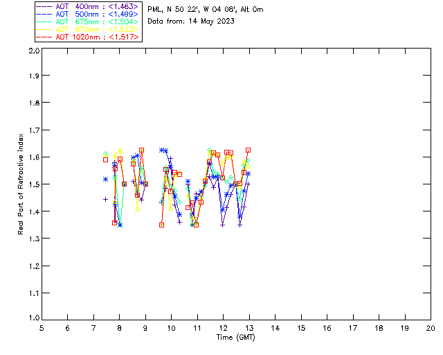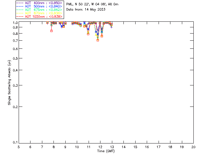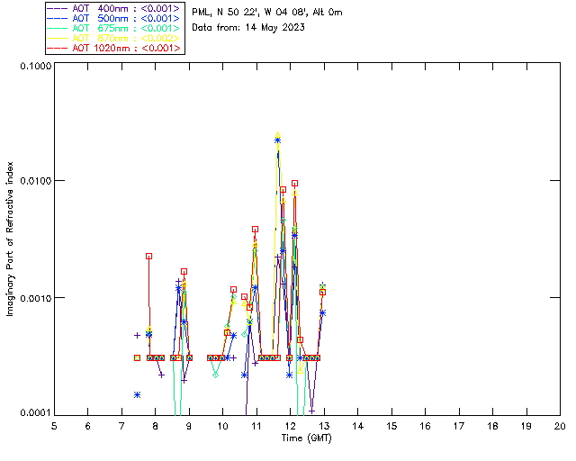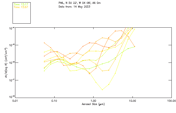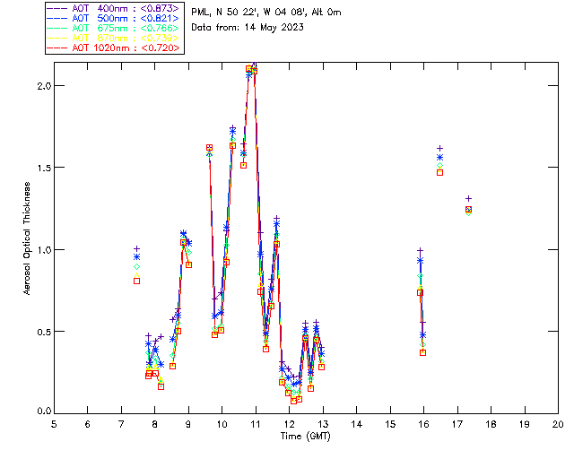 In May 2001 a PREDE POM01-L was installed on the roof of the Plymouth Marine Laboratory to continue the atmospheric correction research of the PML Remote Sensing Group. This was to replace the AERONET CIMEL sunphotometer situated at Rame Head which was decommissioned in 1999. The instrument operates at 7 wavelengths (315, 400, 500, 670, 870, 940 and 1020nm) and scans at pre-set angles away from the solar disk to determine, using the inversion code of Nakajima et al. (2006), various properties of tiny particles called aerosols within the atmospheric column. From these measurements useful atmospheric aerosol parameters such as the Aerosol Optical Thickness (AOT), aerosol size distribution and single scattering albedo can be calculated. Marine aerosols tend to be bigger (D > 1µm) than those generated over the land (0.01 < D < 1µm) and are of a different chemical composition; marine aerosols are salt particles whereas terrestrial aerosols are sulphate compounds.