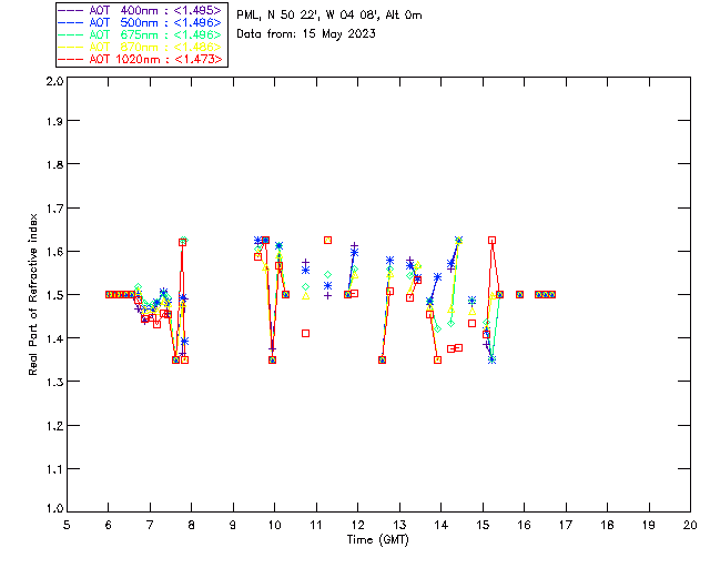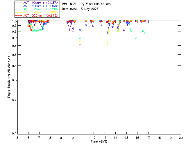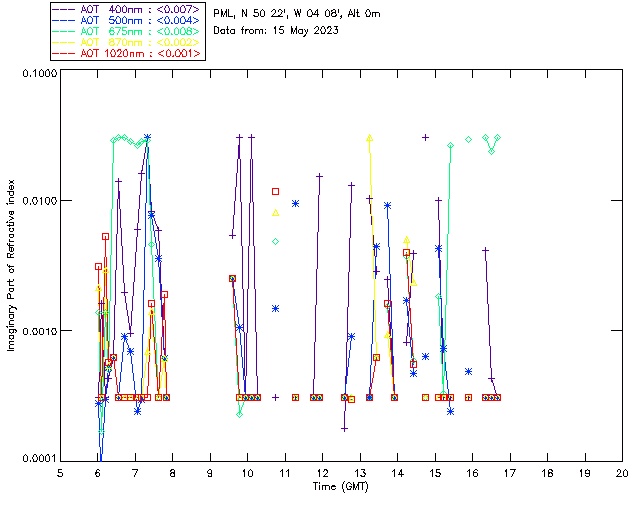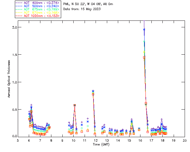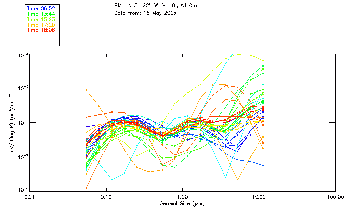 In May 2001 a PREDE POM01-L was installed on the roof of the Plymouth Marine Laboratory to continue the atmospheric correction research of the PML Remote Sensing Group. This was to replace the AERONET CIMEL sunphotometer situated at Rame Head which was decommissioned in 1999. The instrument operates at 7 wavelengths (315, 400, 500, 670, 870, 940 and 1020nm) and scans at pre-set angles away from the solar disk to determine, using the inversion code of Nakajima et al. (2006), various properties of tiny particles called aerosols within the atmospheric column. From these measurements useful atmospheric aerosol parameters such as the Aerosol Optical Thickness (AOT), aerosol size distribution and single scattering albedo can be calculated. Marine aerosols tend to be bigger (D > 1µm) than those generated over the land (0.01 < D < 1µm) and are of a different chemical composition; marine aerosols are salt particles whereas terrestrial aerosols are sulphate compounds.