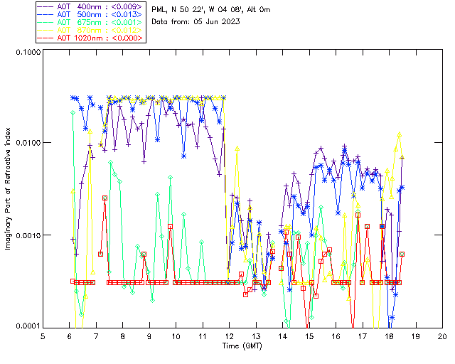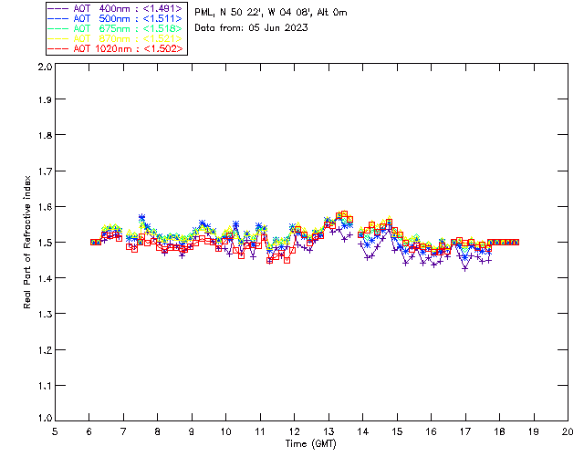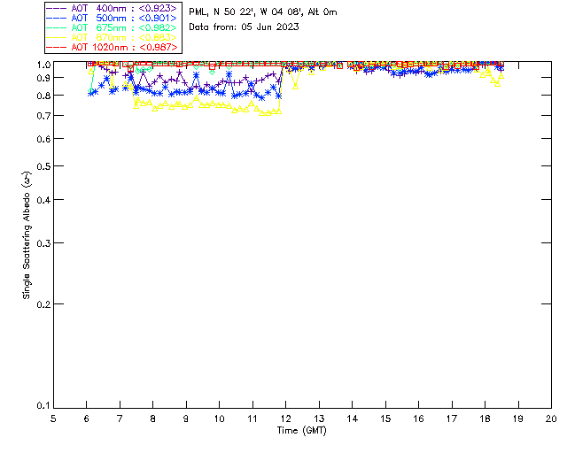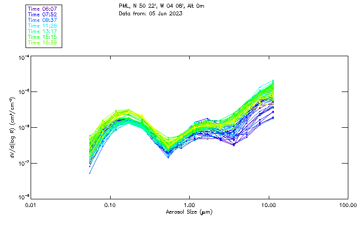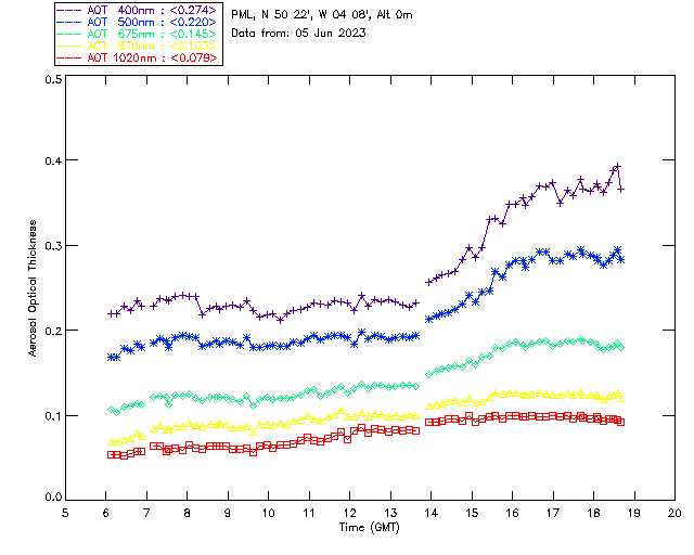 In May 2001 a PREDE POM01-L was installed on the roof of the Plymouth Marine Laboratory to continue the atmospheric correction research of the PML Remote Sensing Group. This was to replace the AERONET CIMEL sunphotometer situated at Rame Head which was decommissioned in 1999. The instrument operates at 7 wavelengths (315, 400, 500, 670, 870, 940 and 1020nm) and scans at pre-set angles away from the solar disk to determine, using the inversion code of Nakajima et al. (2006), various properties of tiny particles called aerosols within the atmospheric column. From these measurements useful atmospheric aerosol parameters such as the Aerosol Optical Thickness (AOT), aerosol size distribution and single scattering albedo can be calculated. Marine aerosols tend to be bigger (D > 1µm) than those generated over the land (0.01 < D < 1µm) and are of a different chemical composition; marine aerosols are salt particles whereas terrestrial aerosols are sulphate compounds.