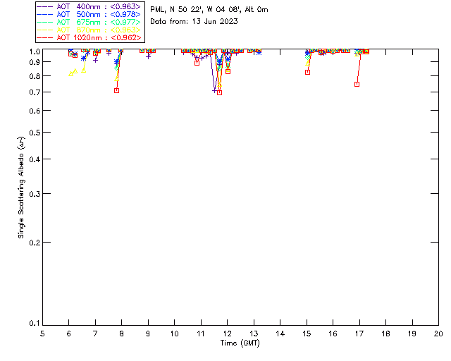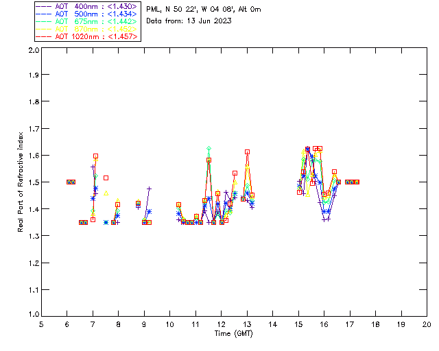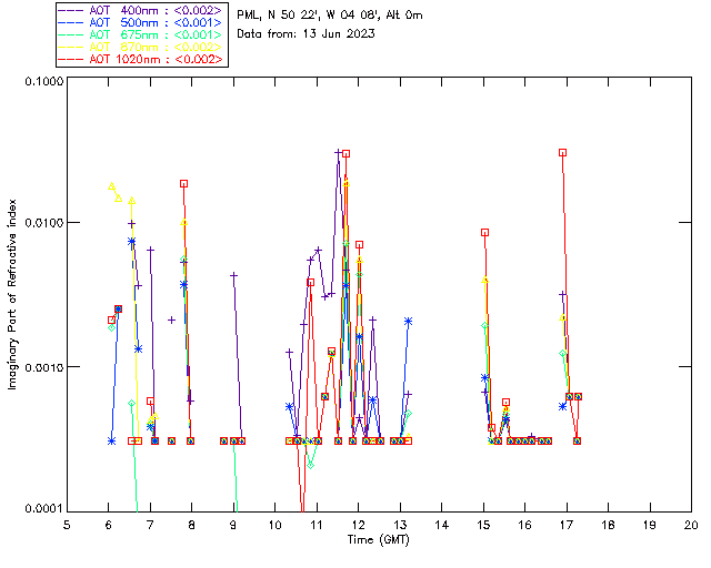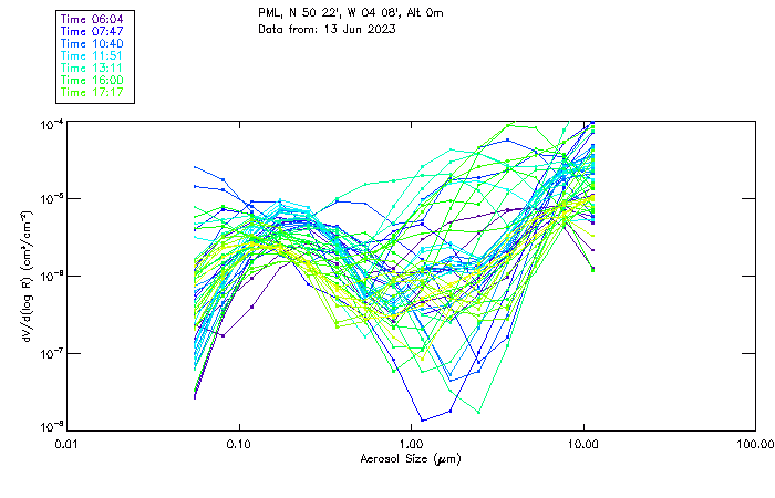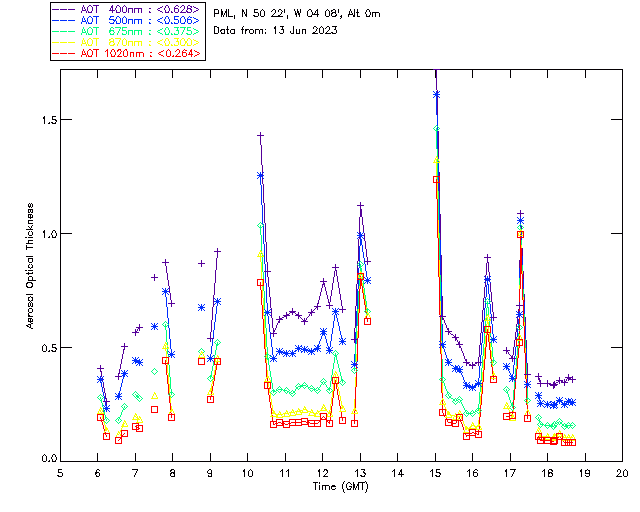 In May 2001 a PREDE POM01-L was installed on the roof of the Plymouth Marine Laboratory to continue the atmospheric correction research of the PML Remote Sensing Group. This was to replace the AERONET CIMEL sunphotometer situated at Rame Head which was decommissioned in 1999. The instrument operates at 7 wavelengths (315, 400, 500, 670, 870, 940 and 1020nm) and scans at pre-set angles away from the solar disk to determine, using the inversion code of Nakajima et al. (2006), various properties of tiny particles called aerosols within the atmospheric column. From these measurements useful atmospheric aerosol parameters such as the Aerosol Optical Thickness (AOT), aerosol size distribution and single scattering albedo can be calculated. Marine aerosols tend to be bigger (D > 1µm) than those generated over the land (0.01 < D < 1µm) and are of a different chemical composition; marine aerosols are salt particles whereas terrestrial aerosols are sulphate compounds.