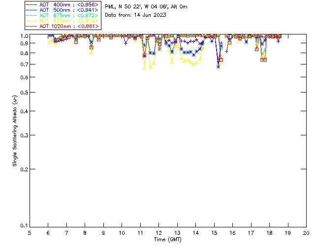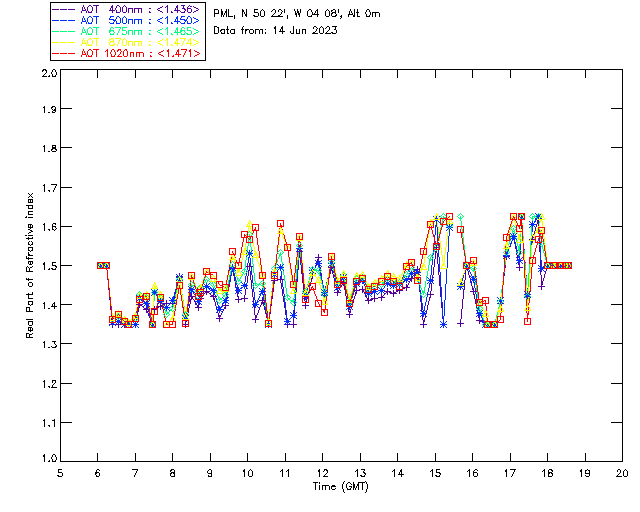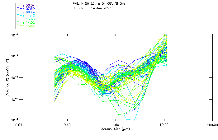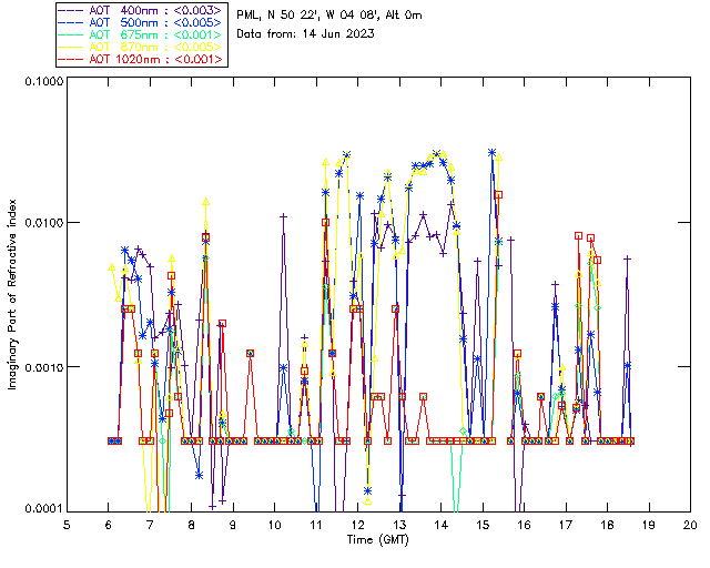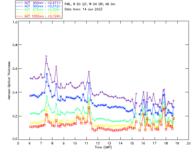 In May 2001 a PREDE POM01-L was installed on the roof of the Plymouth Marine Laboratory to continue the atmospheric correction research of the PML Remote Sensing Group. This was to replace the AERONET CIMEL sunphotometer situated at Rame Head which was decommissioned in 1999. The instrument operates at 7 wavelengths (315, 400, 500, 670, 870, 940 and 1020nm) and scans at pre-set angles away from the solar disk to determine, using the inversion code of Nakajima et al. (2006), various properties of tiny particles called aerosols within the atmospheric column. From these measurements useful atmospheric aerosol parameters such as the Aerosol Optical Thickness (AOT), aerosol size distribution and single scattering albedo can be calculated. Marine aerosols tend to be bigger (D > 1µm) than those generated over the land (0.01 < D < 1µm) and are of a different chemical composition; marine aerosols are salt particles whereas terrestrial aerosols are sulphate compounds.
