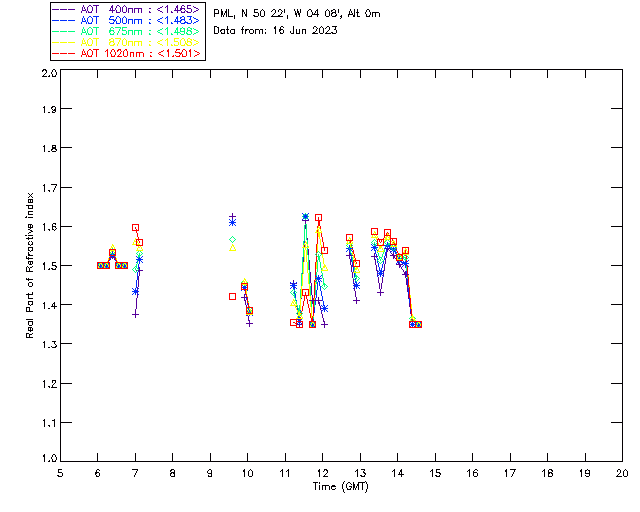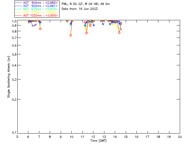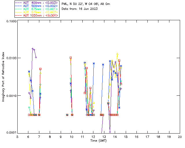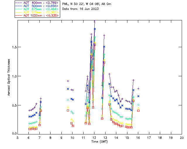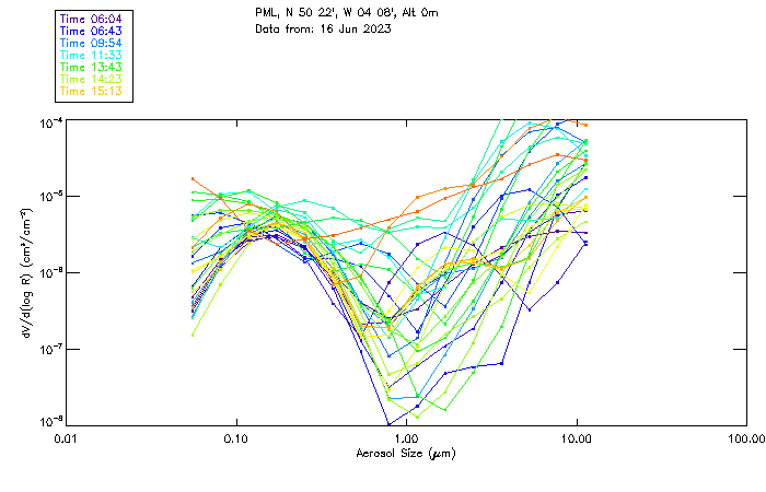 In May 2001 a PREDE POM01-L was installed on the roof of the Plymouth Marine Laboratory to continue the atmospheric correction research of the PML Remote Sensing Group. This was to replace the AERONET CIMEL sunphotometer situated at Rame Head which was decommissioned in 1999. The instrument operates at 7 wavelengths (315, 400, 500, 670, 870, 940 and 1020nm) and scans at pre-set angles away from the solar disk to determine, using the inversion code of Nakajima et al. (2006), various properties of tiny particles called aerosols within the atmospheric column. From these measurements useful atmospheric aerosol parameters such as the Aerosol Optical Thickness (AOT), aerosol size distribution and single scattering albedo can be calculated. Marine aerosols tend to be bigger (D > 1µm) than those generated over the land (0.01 < D < 1µm) and are of a different chemical composition; marine aerosols are salt particles whereas terrestrial aerosols are sulphate compounds.