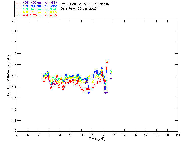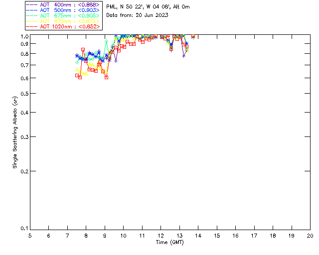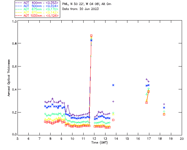 In May 2001 a PREDE POM01-L was installed on the roof of the Plymouth Marine Laboratory to continue the atmospheric correction research of the PML Remote Sensing Group. This was to replace the AERONET CIMEL sunphotometer situated at Rame Head which was decommissioned in 1999. The instrument operates at 7 wavelengths (315, 400, 500, 670, 870, 940 and 1020nm) and scans at pre-set angles away from the solar disk to determine, using the inversion code of Nakajima et al. (2006), various properties of tiny particles called aerosols within the atmospheric column. From these measurements useful atmospheric aerosol parameters such as the Aerosol Optical Thickness (AOT), aerosol size distribution and single scattering albedo can be calculated. Marine aerosols tend to be bigger (D > 1µm) than those generated over the land (0.01 < D < 1µm) and are of a different chemical composition; marine aerosols are salt particles whereas terrestrial aerosols are sulphate compounds.