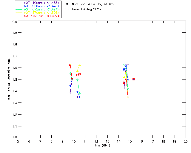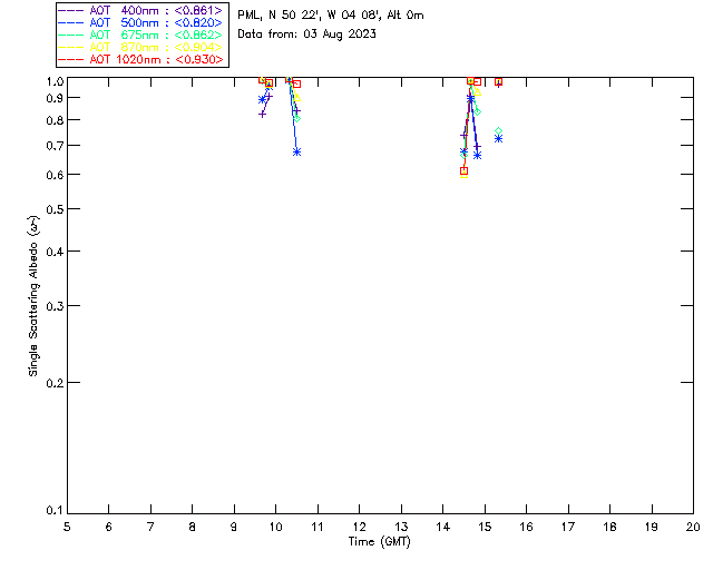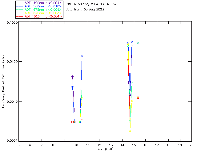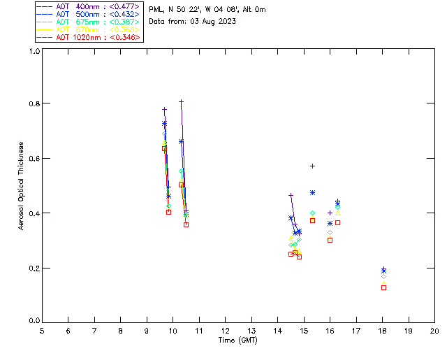 In May 2001 a PREDE POM01-L was installed on the roof of the Plymouth Marine Laboratory to continue the atmospheric correction research of the PML Remote Sensing Group. This was to replace the AERONET CIMEL sunphotometer situated at Rame Head which was decommissioned in 1999. The instrument operates at 7 wavelengths (315, 400, 500, 670, 870, 940 and 1020nm) and scans at pre-set angles away from the solar disk to determine, using the inversion code of Nakajima et al. (2006), various properties of tiny particles called aerosols within the atmospheric column. From these measurements useful atmospheric aerosol parameters such as the Aerosol Optical Thickness (AOT), aerosol size distribution and single scattering albedo can be calculated. Marine aerosols tend to be bigger (D > 1µm) than those generated over the land (0.01 < D < 1µm) and are of a different chemical composition; marine aerosols are salt particles whereas terrestrial aerosols are sulphate compounds.