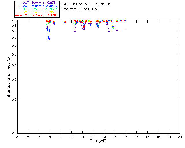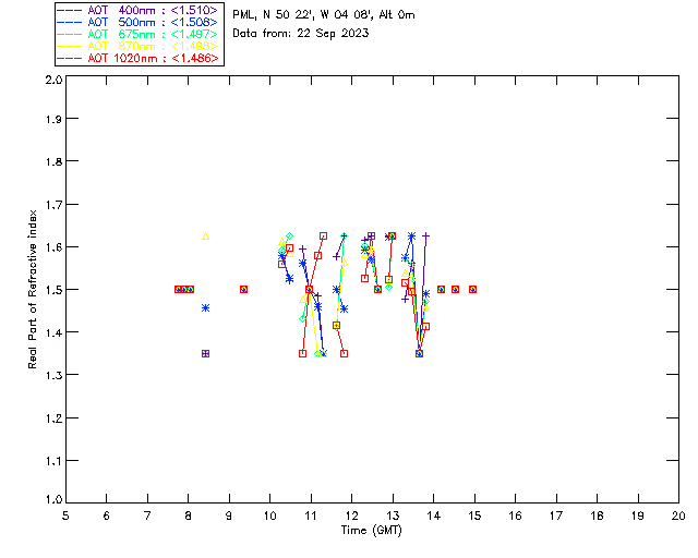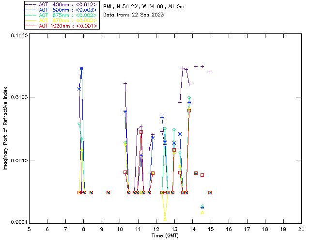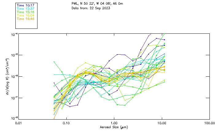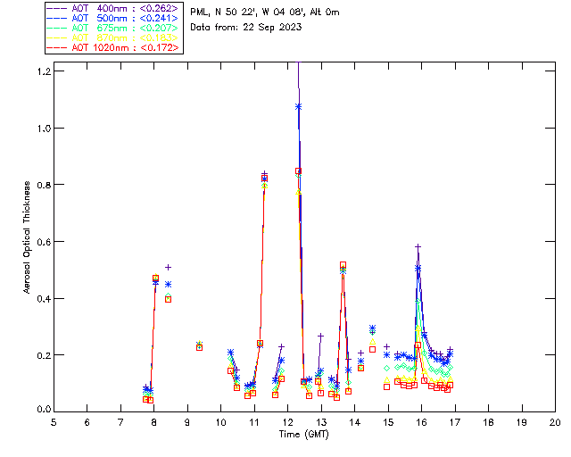 In May 2001 a PREDE POM01-L was installed on the roof of the Plymouth Marine Laboratory to continue the atmospheric correction research of the PML Remote Sensing Group. This was to replace the AERONET CIMEL sunphotometer situated at Rame Head which was decommissioned in 1999. The instrument operates at 7 wavelengths (315, 400, 500, 670, 870, 940 and 1020nm) and scans at pre-set angles away from the solar disk to determine, using the inversion code of Nakajima et al. (2006), various properties of tiny particles called aerosols within the atmospheric column. From these measurements useful atmospheric aerosol parameters such as the Aerosol Optical Thickness (AOT), aerosol size distribution and single scattering albedo can be calculated. Marine aerosols tend to be bigger (D > 1µm) than those generated over the land (0.01 < D < 1µm) and are of a different chemical composition; marine aerosols are salt particles whereas terrestrial aerosols are sulphate compounds.