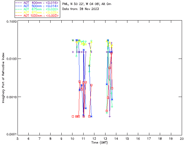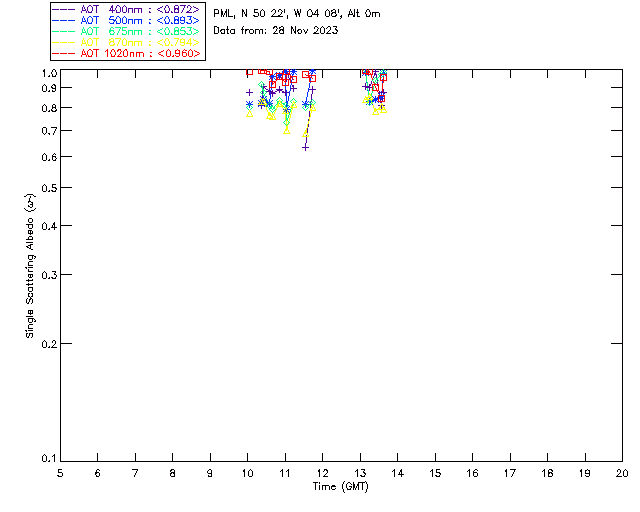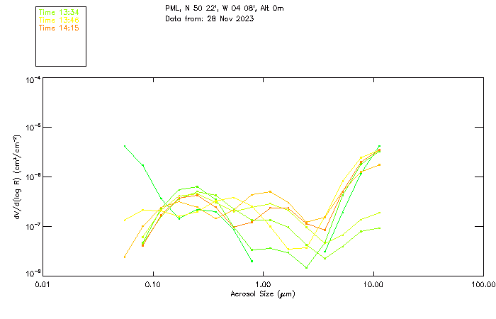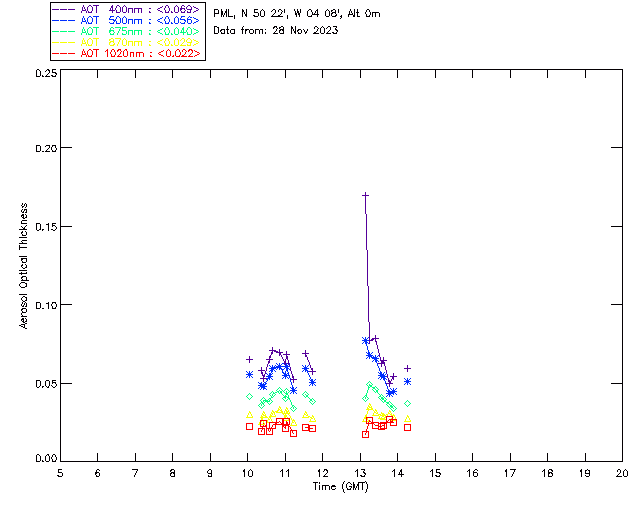 In May 2001 a PREDE POM01-L was installed on the roof of the Plymouth Marine Laboratory to continue the atmospheric correction research of the PML Remote Sensing Group. This was to replace the AERONET CIMEL sunphotometer situated at Rame Head which was decommissioned in 1999. The instrument operates at 7 wavelengths (315, 400, 500, 670, 870, 940 and 1020nm) and scans at pre-set angles away from the solar disk to determine, using the inversion code of Nakajima et al. (2006), various properties of tiny particles called aerosols within the atmospheric column. From these measurements useful atmospheric aerosol parameters such as the Aerosol Optical Thickness (AOT), aerosol size distribution and single scattering albedo can be calculated. Marine aerosols tend to be bigger (D > 1µm) than those generated over the land (0.01 < D < 1µm) and are of a different chemical composition; marine aerosols are salt particles whereas terrestrial aerosols are sulphate compounds.