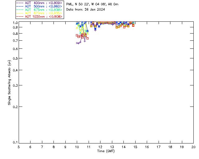 In May 2001 a PREDE POM01-L was installed on the roof of the Plymouth Marine Laboratory to continue the atmospheric correction research of the PML Remote Sensing Group. This was to replace the AERONET CIMEL sunphotometer situated at Rame Head which was decommissioned in 1999. The instrument operates at 7 wavelengths (315, 400, 500, 670, 870, 940 and 1020nm) and scans at pre-set angles away from the solar disk to determine, using the inversion code of Nakajima et al. (2006), various properties of tiny particles called aerosols within the atmospheric column. From these measurements useful atmospheric aerosol parameters such as the Aerosol Optical Thickness (AOT), aerosol size distribution and single scattering albedo can be calculated. Marine aerosols tend to be bigger (D > 1µm) than those generated over the land (0.01 < D < 1µm) and are of a different chemical composition; marine aerosols are salt particles whereas terrestrial aerosols are sulphate compounds.