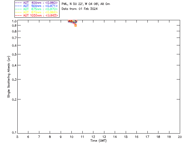In May 2001 a PREDE POM01-L was installed on the roof of the Plymouth Marine Laboratory to continue the atmospheric correction research of the PML Remote Sensing Group. This was to replace the AERONET CIMEL sunphotometer situated at Rame Head which was decommissioned in 1999. The instrument operates at 7 wavelengths (315, 400, 500, 670, 870, 940 and 1020nm) and scans at pre-set angles away from the solar disk to determine, using the inversion code of Nakajima et al. (2006), various properties of tiny particles called aerosols within the atmospheric column. From these measurements useful atmospheric aerosol parameters such as the Aerosol Optical Thickness (AOT), aerosol size distribution and single scattering albedo can be calculated. Marine aerosols tend to be bigger (D > 1µm) than those generated over the land (0.01 < D < 1µm) and are of a different chemical composition; marine aerosols are salt particles whereas terrestrial aerosols are sulphate compounds.
