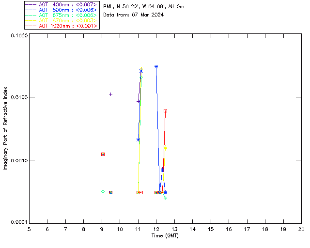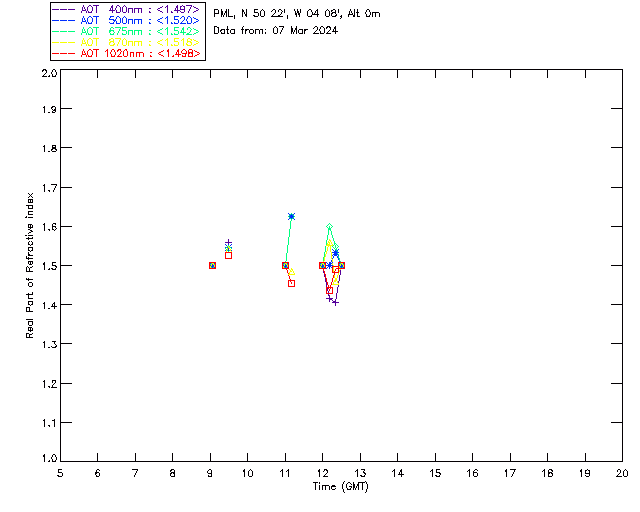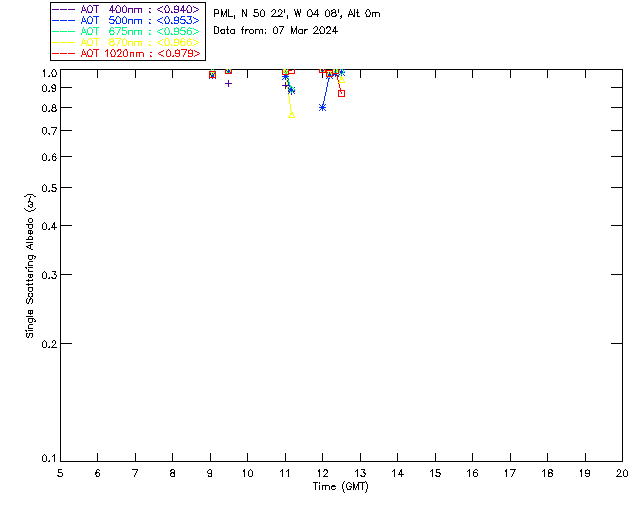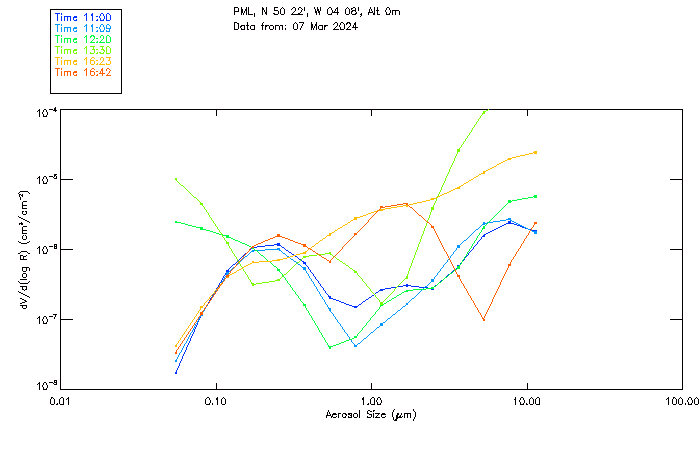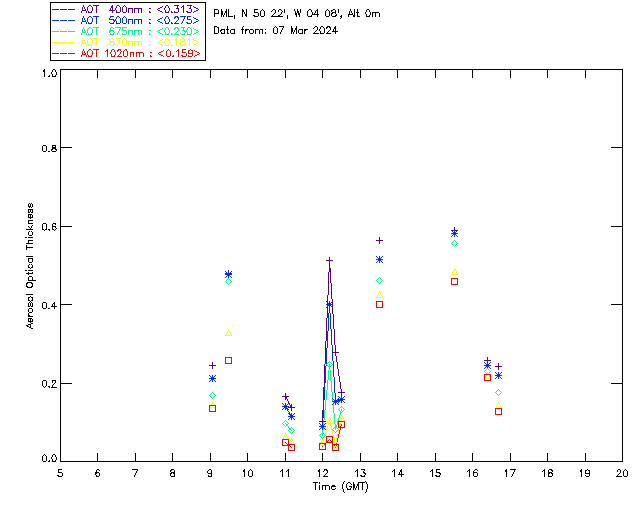 In May 2001 a PREDE POM01-L was installed on the roof of the Plymouth Marine Laboratory to continue the atmospheric correction research of the PML Remote Sensing Group. This was to replace the AERONET CIMEL sunphotometer situated at Rame Head which was decommissioned in 1999. The instrument operates at 7 wavelengths (315, 400, 500, 670, 870, 940 and 1020nm) and scans at pre-set angles away from the solar disk to determine, using the inversion code of Nakajima et al. (2006), various properties of tiny particles called aerosols within the atmospheric column. From these measurements useful atmospheric aerosol parameters such as the Aerosol Optical Thickness (AOT), aerosol size distribution and single scattering albedo can be calculated. Marine aerosols tend to be bigger (D > 1µm) than those generated over the land (0.01 < D < 1µm) and are of a different chemical composition; marine aerosols are salt particles whereas terrestrial aerosols are sulphate compounds.