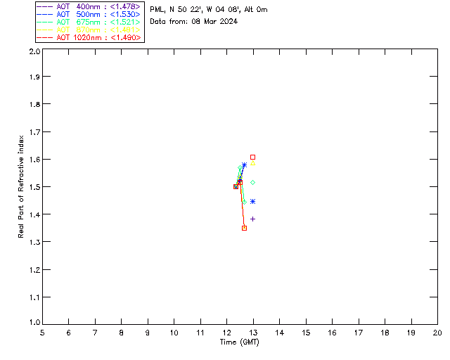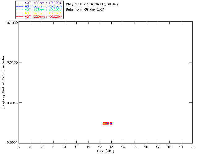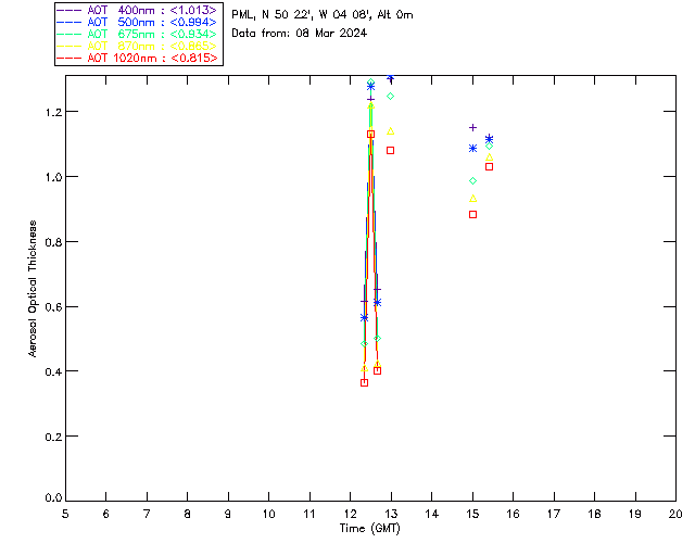 In May 2001 a PREDE POM01-L was installed on the roof of the Plymouth Marine Laboratory to continue the atmospheric correction research of the PML Remote Sensing Group. This was to replace the AERONET CIMEL sunphotometer situated at Rame Head which was decommissioned in 1999. The instrument operates at 7 wavelengths (315, 400, 500, 670, 870, 940 and 1020nm) and scans at pre-set angles away from the solar disk to determine, using the inversion code of Nakajima et al. (2006), various properties of tiny particles called aerosols within the atmospheric column. From these measurements useful atmospheric aerosol parameters such as the Aerosol Optical Thickness (AOT), aerosol size distribution and single scattering albedo can be calculated. Marine aerosols tend to be bigger (D > 1µm) than those generated over the land (0.01 < D < 1µm) and are of a different chemical composition; marine aerosols are salt particles whereas terrestrial aerosols are sulphate compounds.