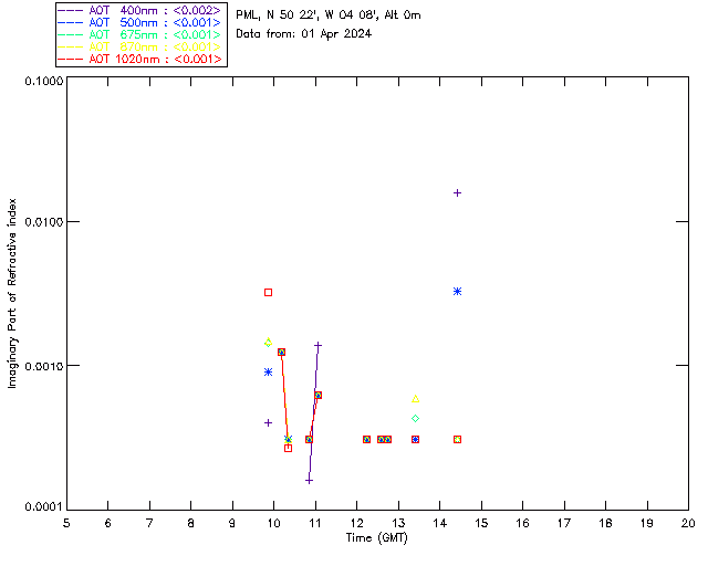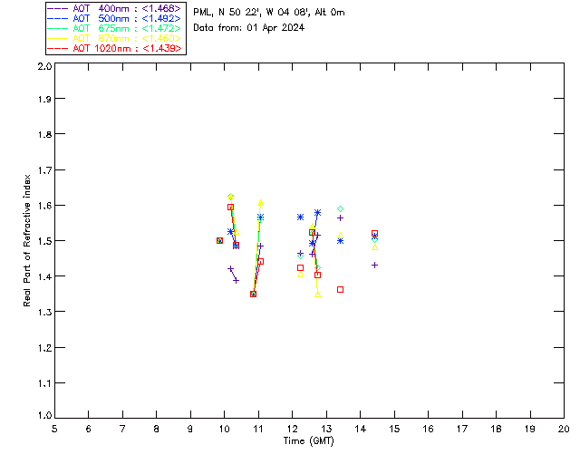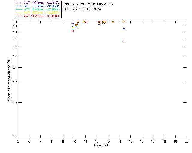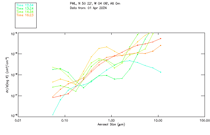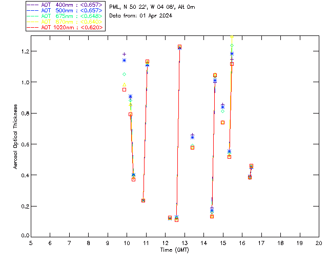 In May 2001 a PREDE POM01-L was installed on the roof of the Plymouth Marine Laboratory to continue the atmospheric correction research of the PML Remote Sensing Group. This was to replace the AERONET CIMEL sunphotometer situated at Rame Head which was decommissioned in 1999. The instrument operates at 7 wavelengths (315, 400, 500, 670, 870, 940 and 1020nm) and scans at pre-set angles away from the solar disk to determine, using the inversion code of Nakajima et al. (2006), various properties of tiny particles called aerosols within the atmospheric column. From these measurements useful atmospheric aerosol parameters such as the Aerosol Optical Thickness (AOT), aerosol size distribution and single scattering albedo can be calculated. Marine aerosols tend to be bigger (D > 1µm) than those generated over the land (0.01 < D < 1µm) and are of a different chemical composition; marine aerosols are salt particles whereas terrestrial aerosols are sulphate compounds.
