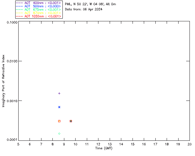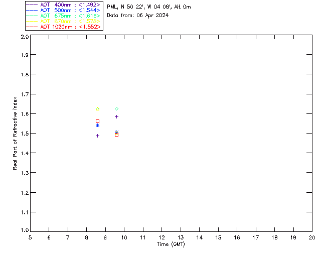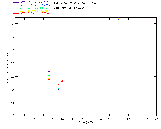 In May 2001 a PREDE POM01-L was installed on the roof of the Plymouth Marine Laboratory to continue the atmospheric correction research of the PML Remote Sensing Group. This was to replace the AERONET CIMEL sunphotometer situated at Rame Head which was decommissioned in 1999. The instrument operates at 7 wavelengths (315, 400, 500, 670, 870, 940 and 1020nm) and scans at pre-set angles away from the solar disk to determine, using the inversion code of Nakajima et al. (2006), various properties of tiny particles called aerosols within the atmospheric column. From these measurements useful atmospheric aerosol parameters such as the Aerosol Optical Thickness (AOT), aerosol size distribution and single scattering albedo can be calculated. Marine aerosols tend to be bigger (D > 1µm) than those generated over the land (0.01 < D < 1µm) and are of a different chemical composition; marine aerosols are salt particles whereas terrestrial aerosols are sulphate compounds.
