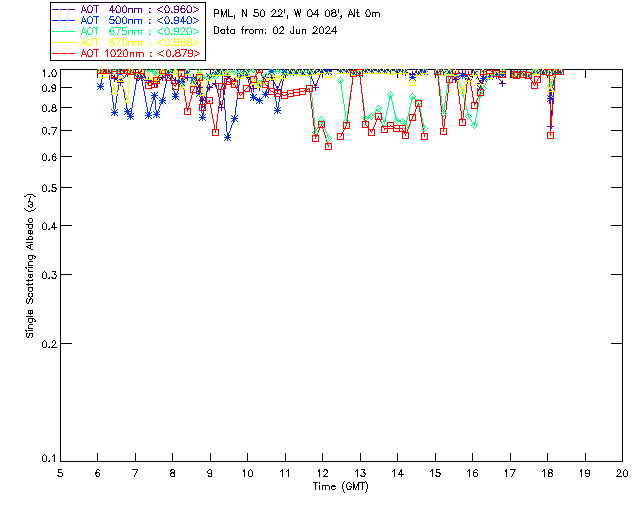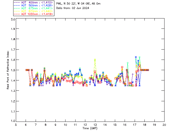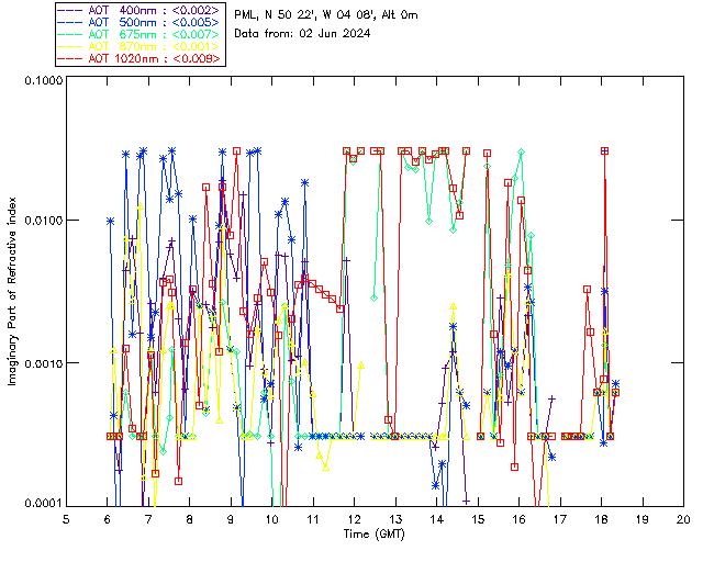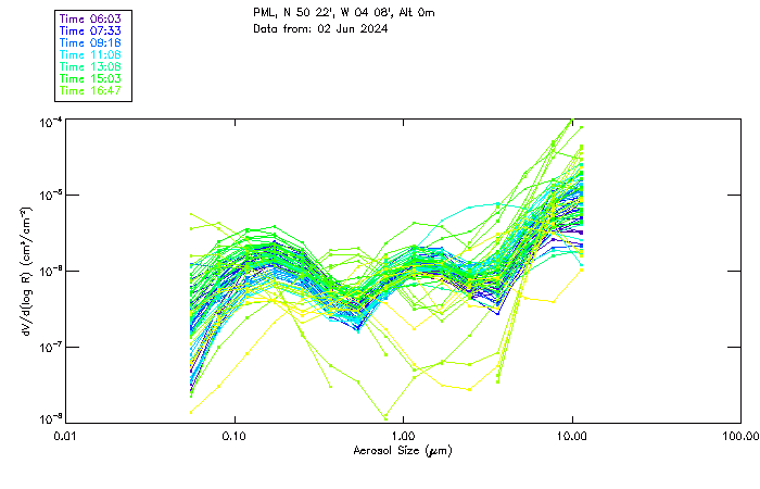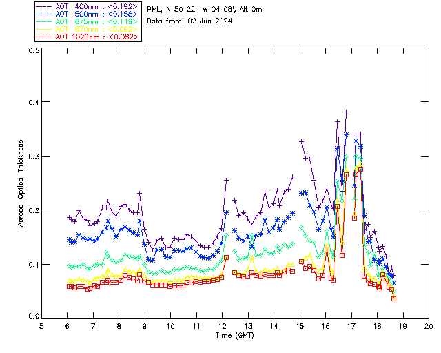 In May 2001 a PREDE POM01-L was installed on the roof of the Plymouth Marine Laboratory to continue the atmospheric correction research of the PML Remote Sensing Group. This was to replace the AERONET CIMEL sunphotometer situated at Rame Head which was decommissioned in 1999. The instrument operates at 7 wavelengths (315, 400, 500, 670, 870, 940 and 1020nm) and scans at pre-set angles away from the solar disk to determine, using the inversion code of Nakajima et al. (2006), various properties of tiny particles called aerosols within the atmospheric column. From these measurements useful atmospheric aerosol parameters such as the Aerosol Optical Thickness (AOT), aerosol size distribution and single scattering albedo can be calculated. Marine aerosols tend to be bigger (D > 1µm) than those generated over the land (0.01 < D < 1µm) and are of a different chemical composition; marine aerosols are salt particles whereas terrestrial aerosols are sulphate compounds.