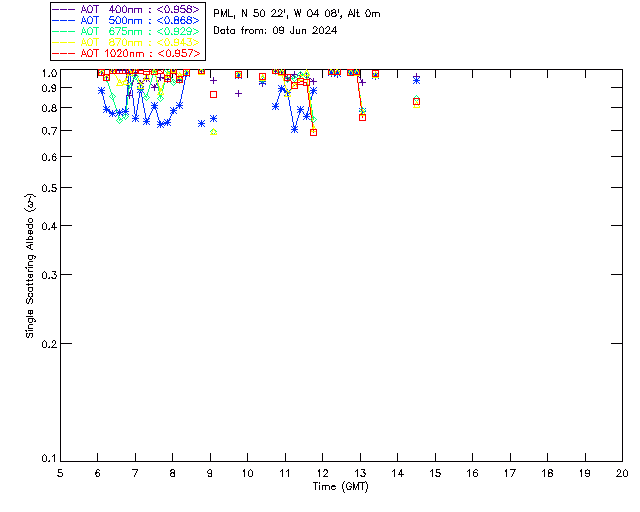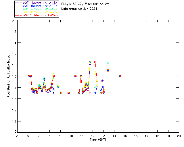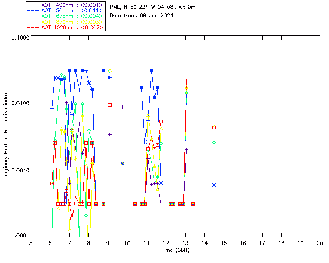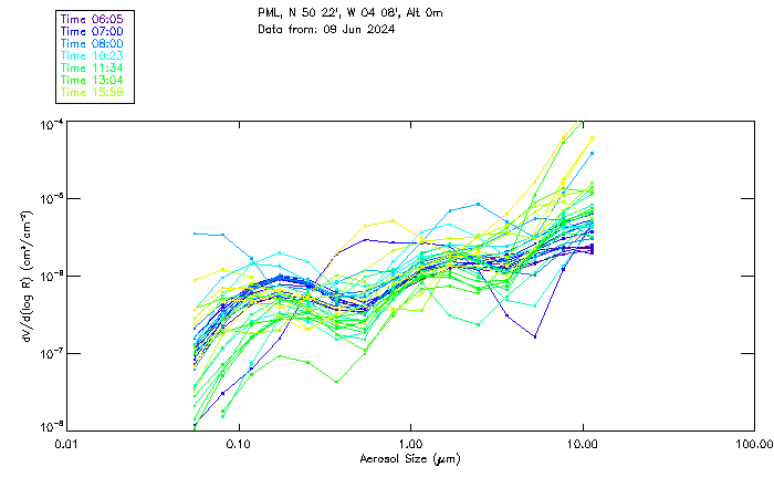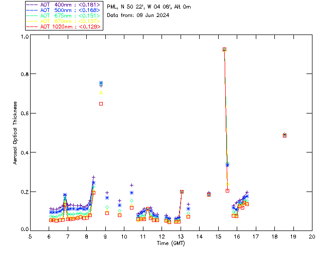 In May 2001 a PREDE POM01-L was installed on the roof of the Plymouth Marine Laboratory to continue the atmospheric correction research of the PML Remote Sensing Group. This was to replace the AERONET CIMEL sunphotometer situated at Rame Head which was decommissioned in 1999. The instrument operates at 7 wavelengths (315, 400, 500, 670, 870, 940 and 1020nm) and scans at pre-set angles away from the solar disk to determine, using the inversion code of Nakajima et al. (2006), various properties of tiny particles called aerosols within the atmospheric column. From these measurements useful atmospheric aerosol parameters such as the Aerosol Optical Thickness (AOT), aerosol size distribution and single scattering albedo can be calculated. Marine aerosols tend to be bigger (D > 1µm) than those generated over the land (0.01 < D < 1µm) and are of a different chemical composition; marine aerosols are salt particles whereas terrestrial aerosols are sulphate compounds.