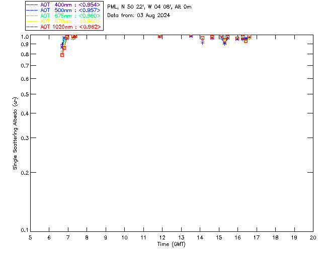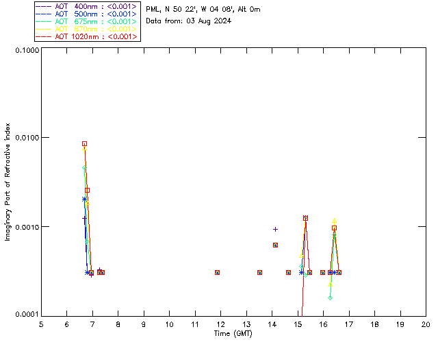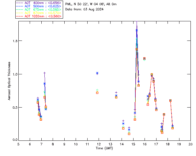 In May 2001 a PREDE POM01-L was installed on the roof of the Plymouth Marine Laboratory to continue the atmospheric correction research of the PML Remote Sensing Group. This was to replace the AERONET CIMEL sunphotometer situated at Rame Head which was decommissioned in 1999. The instrument operates at 7 wavelengths (315, 400, 500, 670, 870, 940 and 1020nm) and scans at pre-set angles away from the solar disk to determine, using the inversion code of Nakajima et al. (2006), various properties of tiny particles called aerosols within the atmospheric column. From these measurements useful atmospheric aerosol parameters such as the Aerosol Optical Thickness (AOT), aerosol size distribution and single scattering albedo can be calculated. Marine aerosols tend to be bigger (D > 1µm) than those generated over the land (0.01 < D < 1µm) and are of a different chemical composition; marine aerosols are salt particles whereas terrestrial aerosols are sulphate compounds.