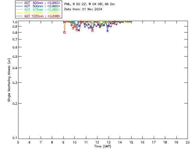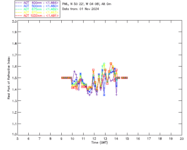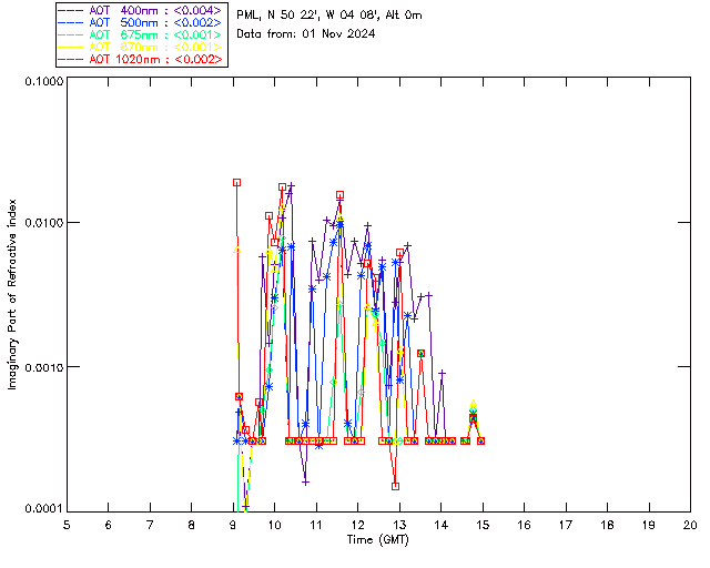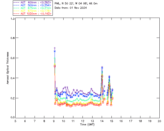 In May 2001 a PREDE POM01-L was installed on the roof of the Plymouth Marine Laboratory to continue the atmospheric correction research of the PML Remote Sensing Group. This was to replace the AERONET CIMEL sunphotometer situated at Rame Head which was decommissioned in 1999. The instrument operates at 7 wavelengths (315, 400, 500, 670, 870, 940 and 1020nm) and scans at pre-set angles away from the solar disk to determine, using the inversion code of Nakajima et al. (2006), various properties of tiny particles called aerosols within the atmospheric column. From these measurements useful atmospheric aerosol parameters such as the Aerosol Optical Thickness (AOT), aerosol size distribution and single scattering albedo can be calculated. Marine aerosols tend to be bigger (D > 1µm) than those generated over the land (0.01 < D < 1µm) and are of a different chemical composition; marine aerosols are salt particles whereas terrestrial aerosols are sulphate compounds.