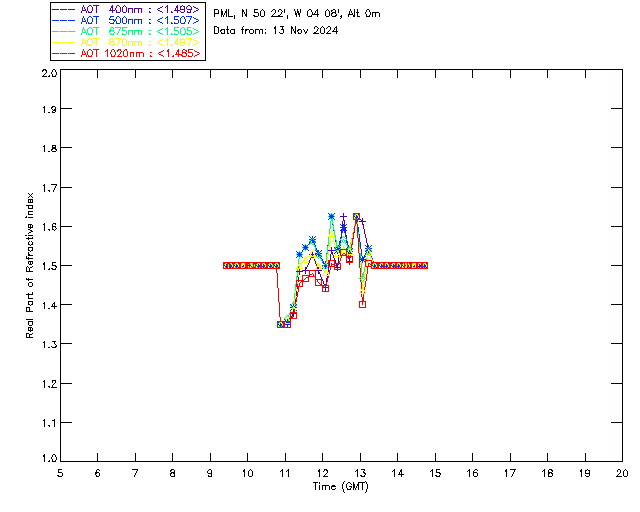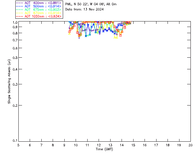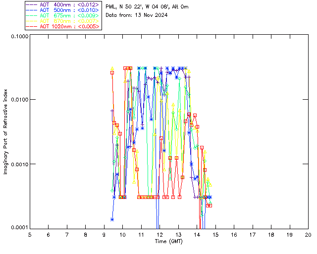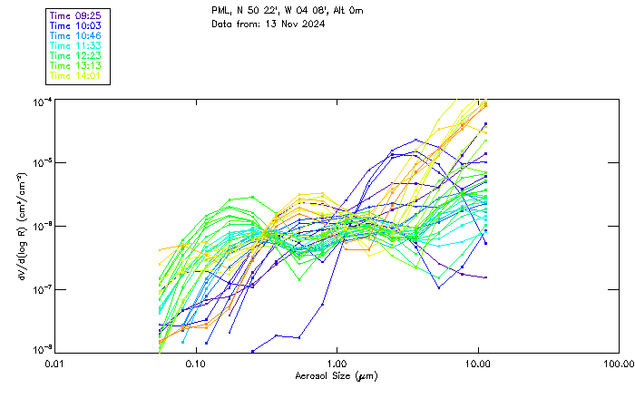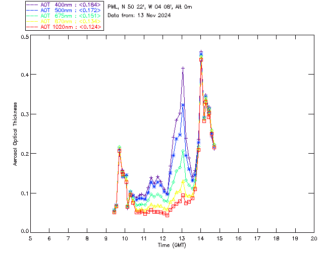 In May 2001 a PREDE POM01-L was installed on the roof of the Plymouth Marine Laboratory to continue the atmospheric correction research of the PML Remote Sensing Group. This was to replace the AERONET CIMEL sunphotometer situated at Rame Head which was decommissioned in 1999. The instrument operates at 7 wavelengths (315, 400, 500, 670, 870, 940 and 1020nm) and scans at pre-set angles away from the solar disk to determine, using the inversion code of Nakajima et al. (2006), various properties of tiny particles called aerosols within the atmospheric column. From these measurements useful atmospheric aerosol parameters such as the Aerosol Optical Thickness (AOT), aerosol size distribution and single scattering albedo can be calculated. Marine aerosols tend to be bigger (D > 1µm) than those generated over the land (0.01 < D < 1µm) and are of a different chemical composition; marine aerosols are salt particles whereas terrestrial aerosols are sulphate compounds.