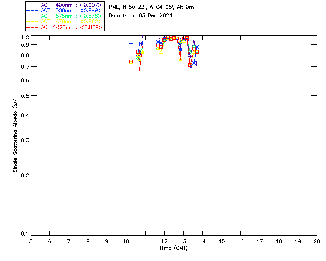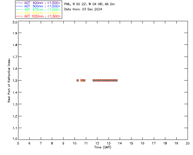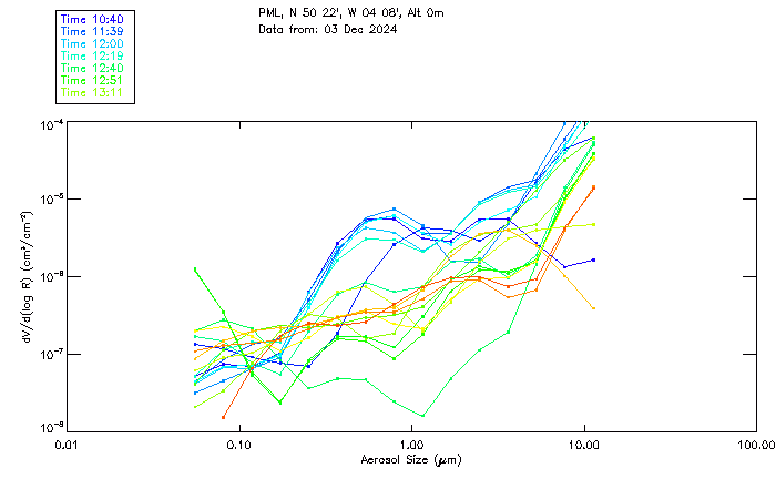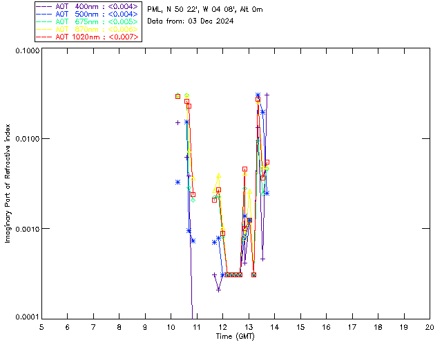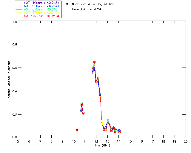 In May 2001 a PREDE POM01-L was installed on the roof of the Plymouth Marine Laboratory to continue the atmospheric correction research of the PML Remote Sensing Group. This was to replace the AERONET CIMEL sunphotometer situated at Rame Head which was decommissioned in 1999. The instrument operates at 7 wavelengths (315, 400, 500, 670, 870, 940 and 1020nm) and scans at pre-set angles away from the solar disk to determine, using the inversion code of Nakajima et al. (2006), various properties of tiny particles called aerosols within the atmospheric column. From these measurements useful atmospheric aerosol parameters such as the Aerosol Optical Thickness (AOT), aerosol size distribution and single scattering albedo can be calculated. Marine aerosols tend to be bigger (D > 1µm) than those generated over the land (0.01 < D < 1µm) and are of a different chemical composition; marine aerosols are salt particles whereas terrestrial aerosols are sulphate compounds.
