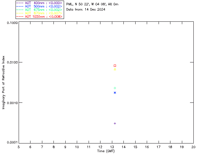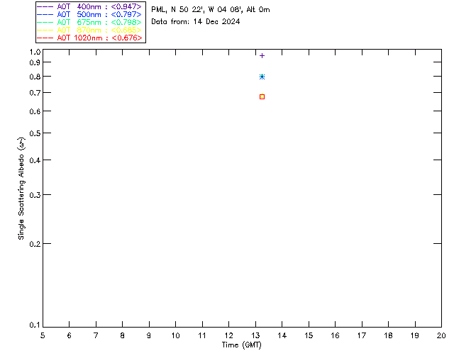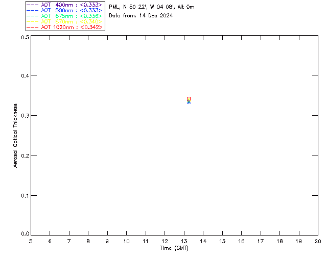 In May 2001 a PREDE POM01-L was installed on the roof of the Plymouth Marine Laboratory to continue the atmospheric correction research of the PML Remote Sensing Group. This was to replace the AERONET CIMEL sunphotometer situated at Rame Head which was decommissioned in 1999. The instrument operates at 7 wavelengths (315, 400, 500, 670, 870, 940 and 1020nm) and scans at pre-set angles away from the solar disk to determine, using the inversion code of Nakajima et al. (2006), various properties of tiny particles called aerosols within the atmospheric column. From these measurements useful atmospheric aerosol parameters such as the Aerosol Optical Thickness (AOT), aerosol size distribution and single scattering albedo can be calculated. Marine aerosols tend to be bigger (D > 1µm) than those generated over the land (0.01 < D < 1µm) and are of a different chemical composition; marine aerosols are salt particles whereas terrestrial aerosols are sulphate compounds.