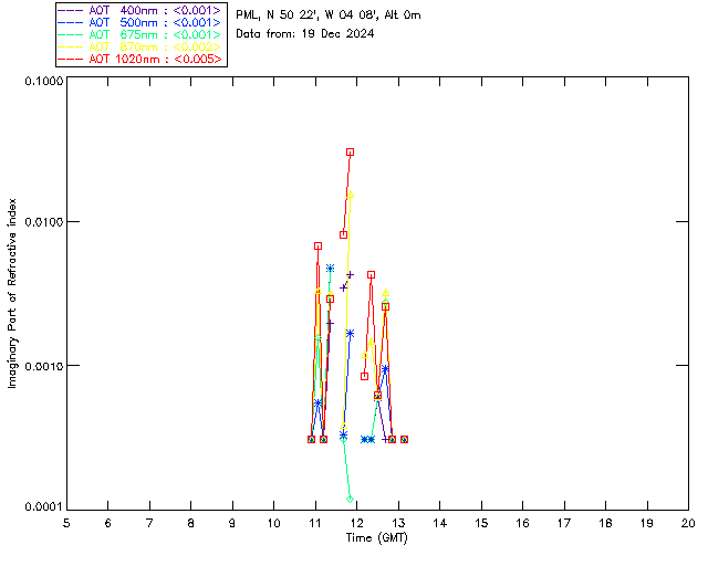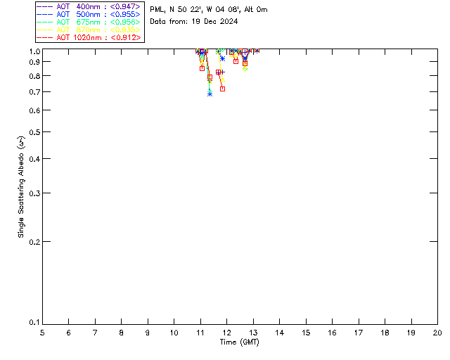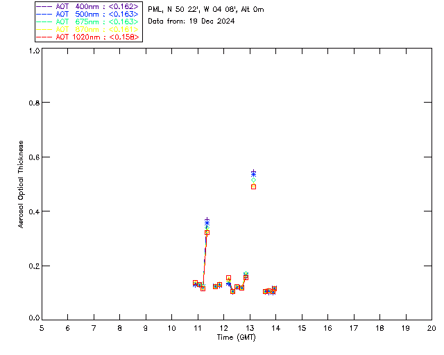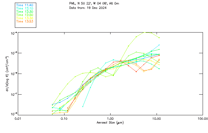 In May 2001 a PREDE POM01-L was installed on the roof of the Plymouth Marine Laboratory to continue the atmospheric correction research of the PML Remote Sensing Group. This was to replace the AERONET CIMEL sunphotometer situated at Rame Head which was decommissioned in 1999. The instrument operates at 7 wavelengths (315, 400, 500, 670, 870, 940 and 1020nm) and scans at pre-set angles away from the solar disk to determine, using the inversion code of Nakajima et al. (2006), various properties of tiny particles called aerosols within the atmospheric column. From these measurements useful atmospheric aerosol parameters such as the Aerosol Optical Thickness (AOT), aerosol size distribution and single scattering albedo can be calculated. Marine aerosols tend to be bigger (D > 1µm) than those generated over the land (0.01 < D < 1µm) and are of a different chemical composition; marine aerosols are salt particles whereas terrestrial aerosols are sulphate compounds.