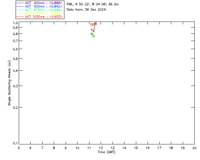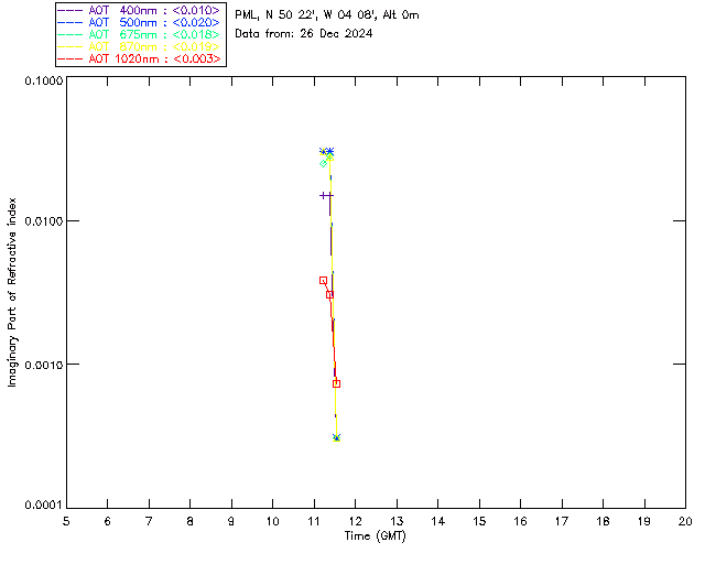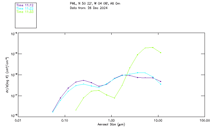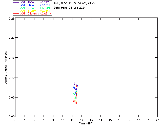 In May 2001 a PREDE POM01-L was installed on the roof of the Plymouth Marine Laboratory to continue the atmospheric correction research of the PML Remote Sensing Group. This was to replace the AERONET CIMEL sunphotometer situated at Rame Head which was decommissioned in 1999. The instrument operates at 7 wavelengths (315, 400, 500, 670, 870, 940 and 1020nm) and scans at pre-set angles away from the solar disk to determine, using the inversion code of Nakajima et al. (2006), various properties of tiny particles called aerosols within the atmospheric column. From these measurements useful atmospheric aerosol parameters such as the Aerosol Optical Thickness (AOT), aerosol size distribution and single scattering albedo can be calculated. Marine aerosols tend to be bigger (D > 1µm) than those generated over the land (0.01 < D < 1µm) and are of a different chemical composition; marine aerosols are salt particles whereas terrestrial aerosols are sulphate compounds.