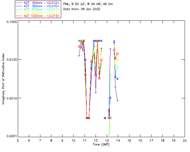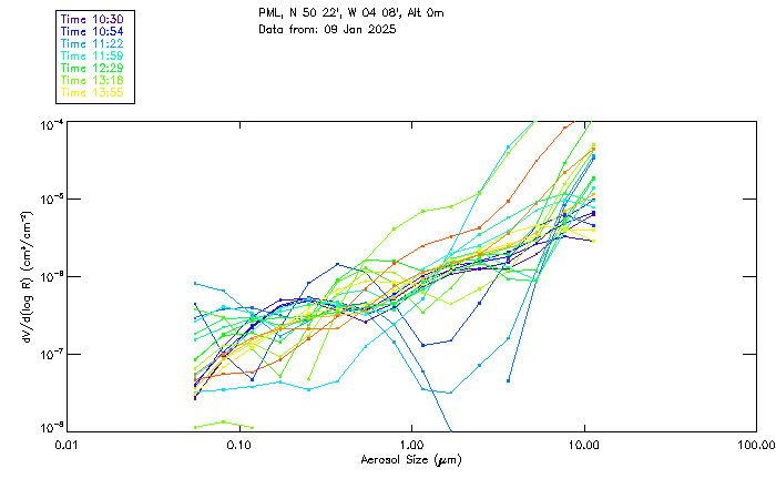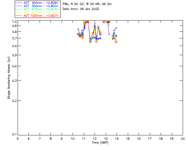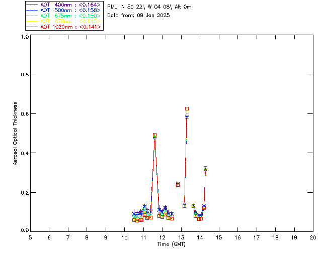 In May 2001 a PREDE POM01-L was installed on the roof of the Plymouth Marine Laboratory to continue the atmospheric correction research of the PML Remote Sensing Group. This was to replace the AERONET CIMEL sunphotometer situated at Rame Head which was decommissioned in 1999. The instrument operates at 7 wavelengths (315, 400, 500, 670, 870, 940 and 1020nm) and scans at pre-set angles away from the solar disk to determine, using the inversion code of Nakajima et al. (2006), various properties of tiny particles called aerosols within the atmospheric column. From these measurements useful atmospheric aerosol parameters such as the Aerosol Optical Thickness (AOT), aerosol size distribution and single scattering albedo can be calculated. Marine aerosols tend to be bigger (D > 1µm) than those generated over the land (0.01 < D < 1µm) and are of a different chemical composition; marine aerosols are salt particles whereas terrestrial aerosols are sulphate compounds.