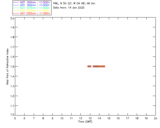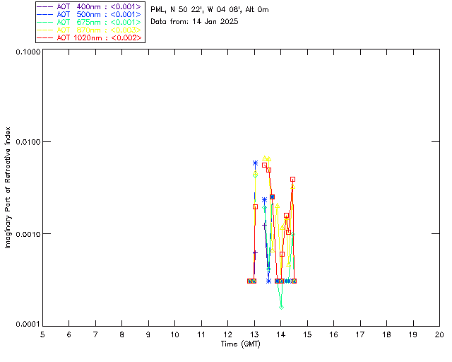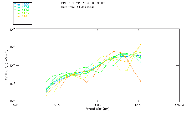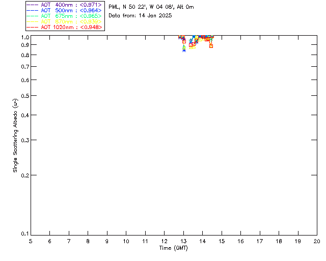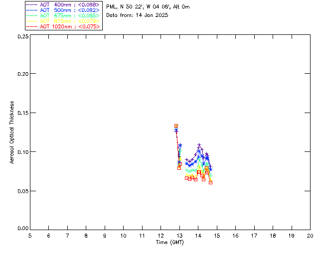 In May 2001 a PREDE POM01-L was installed on the roof of the Plymouth Marine Laboratory to continue the atmospheric correction research of the PML Remote Sensing Group. This was to replace the AERONET CIMEL sunphotometer situated at Rame Head which was decommissioned in 1999. The instrument operates at 7 wavelengths (315, 400, 500, 670, 870, 940 and 1020nm) and scans at pre-set angles away from the solar disk to determine, using the inversion code of Nakajima et al. (2006), various properties of tiny particles called aerosols within the atmospheric column. From these measurements useful atmospheric aerosol parameters such as the Aerosol Optical Thickness (AOT), aerosol size distribution and single scattering albedo can be calculated. Marine aerosols tend to be bigger (D > 1µm) than those generated over the land (0.01 < D < 1µm) and are of a different chemical composition; marine aerosols are salt particles whereas terrestrial aerosols are sulphate compounds.