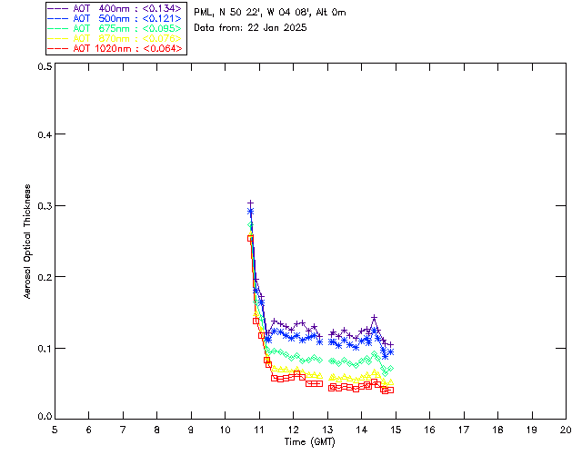 In May 2001 a PREDE POM01-L was installed on the roof of the Plymouth Marine Laboratory to continue the atmospheric correction research of the PML Remote Sensing Group. This was to replace the AERONET CIMEL sunphotometer situated at Rame Head which was decommissioned in 1999. The instrument operates at 7 wavelengths (315, 400, 500, 670, 870, 940 and 1020nm) and scans at pre-set angles away from the solar disk to determine, using the inversion code of Nakajima et al. (2006), various properties of tiny particles called aerosols within the atmospheric column. From these measurements useful atmospheric aerosol parameters such as the Aerosol Optical Thickness (AOT), aerosol size distribution and single scattering albedo can be calculated. Marine aerosols tend to be bigger (D > 1µm) than those generated over the land (0.01 < D < 1µm) and are of a different chemical composition; marine aerosols are salt particles whereas terrestrial aerosols are sulphate compounds.
