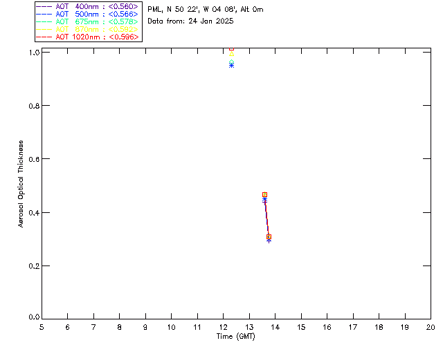 In May 2001 a PREDE POM01-L was installed on the roof of the Plymouth Marine Laboratory to continue the atmospheric correction research of the PML Remote Sensing Group. This was to replace the AERONET CIMEL sunphotometer situated at Rame Head which was decommissioned in 1999. The instrument operates at 7 wavelengths (315, 400, 500, 670, 870, 940 and 1020nm) and scans at pre-set angles away from the solar disk to determine, using the inversion code of Nakajima et al. (2006), various properties of tiny particles called aerosols within the atmospheric column. From these measurements useful atmospheric aerosol parameters such as the Aerosol Optical Thickness (AOT), aerosol size distribution and single scattering albedo can be calculated. Marine aerosols tend to be bigger (D > 1µm) than those generated over the land (0.01 < D < 1µm) and are of a different chemical composition; marine aerosols are salt particles whereas terrestrial aerosols are sulphate compounds.