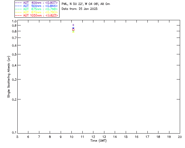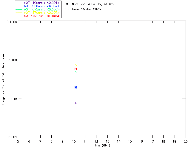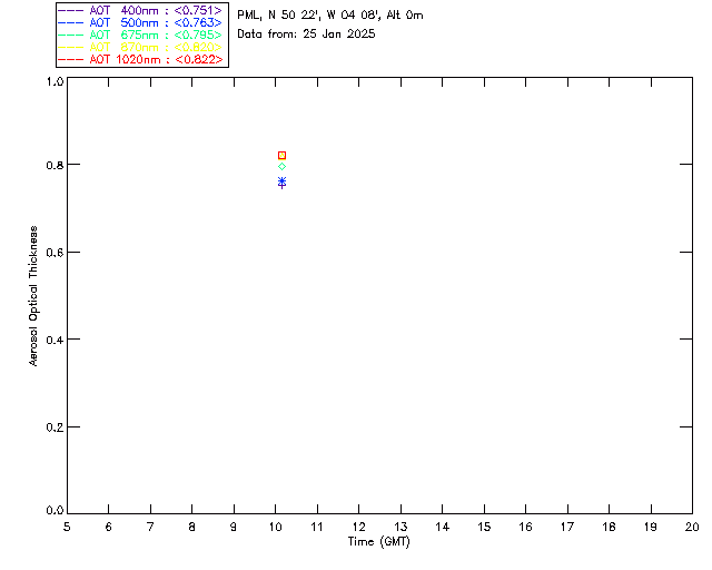 In May 2001 a PREDE POM01-L was installed on the roof of the Plymouth Marine Laboratory to continue the atmospheric correction research of the PML Remote Sensing Group. This was to replace the AERONET CIMEL sunphotometer situated at Rame Head which was decommissioned in 1999. The instrument operates at 7 wavelengths (315, 400, 500, 670, 870, 940 and 1020nm) and scans at pre-set angles away from the solar disk to determine, using the inversion code of Nakajima et al. (2006), various properties of tiny particles called aerosols within the atmospheric column. From these measurements useful atmospheric aerosol parameters such as the Aerosol Optical Thickness (AOT), aerosol size distribution and single scattering albedo can be calculated. Marine aerosols tend to be bigger (D > 1µm) than those generated over the land (0.01 < D < 1µm) and are of a different chemical composition; marine aerosols are salt particles whereas terrestrial aerosols are sulphate compounds.