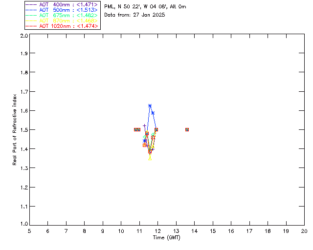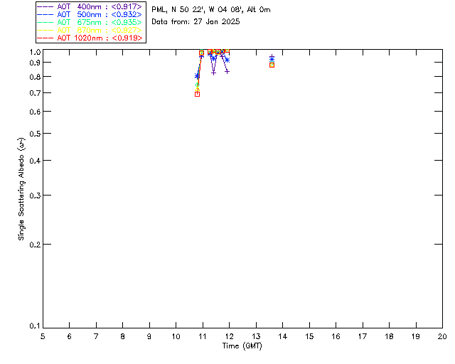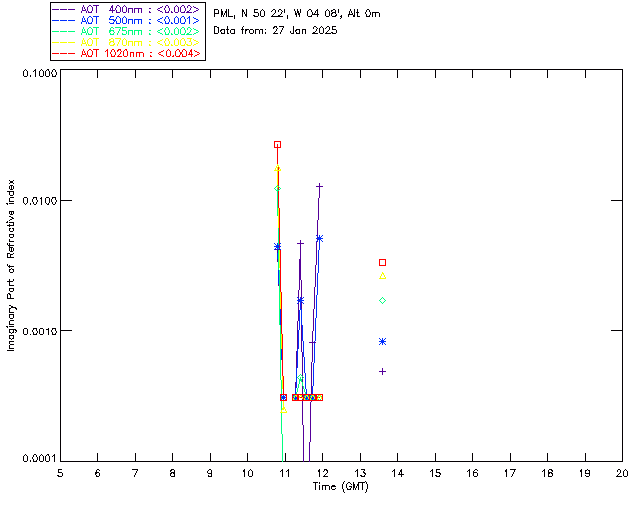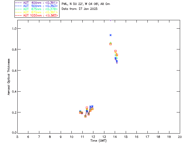 In May 2001 a PREDE POM01-L was installed on the roof of the Plymouth Marine Laboratory to continue the atmospheric correction research of the PML Remote Sensing Group. This was to replace the AERONET CIMEL sunphotometer situated at Rame Head which was decommissioned in 1999. The instrument operates at 7 wavelengths (315, 400, 500, 670, 870, 940 and 1020nm) and scans at pre-set angles away from the solar disk to determine, using the inversion code of Nakajima et al. (2006), various properties of tiny particles called aerosols within the atmospheric column. From these measurements useful atmospheric aerosol parameters such as the Aerosol Optical Thickness (AOT), aerosol size distribution and single scattering albedo can be calculated. Marine aerosols tend to be bigger (D > 1µm) than those generated over the land (0.01 < D < 1µm) and are of a different chemical composition; marine aerosols are salt particles whereas terrestrial aerosols are sulphate compounds.