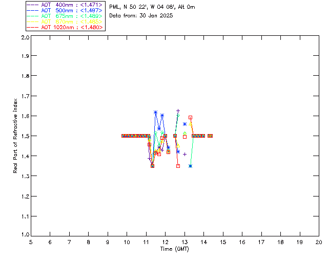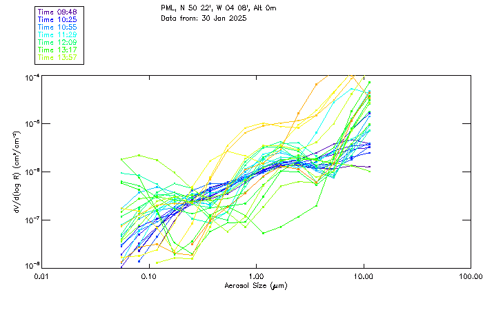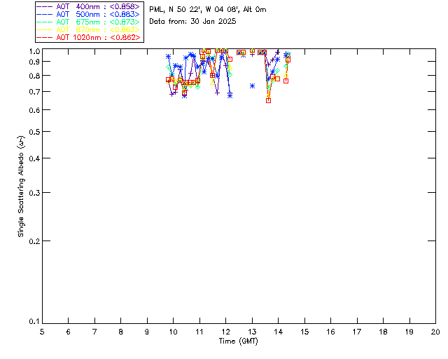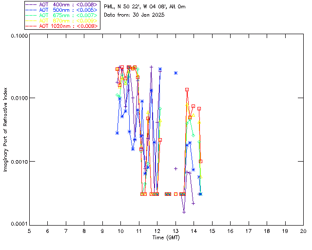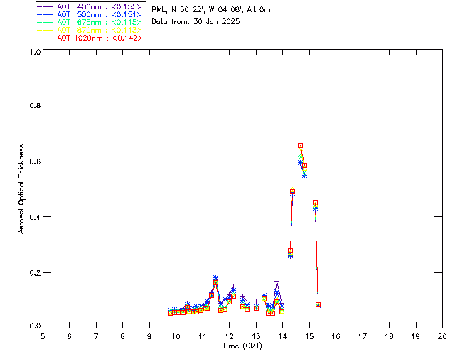 In May 2001 a PREDE POM01-L was installed on the roof of the Plymouth Marine Laboratory to continue the atmospheric correction research of the PML Remote Sensing Group. This was to replace the AERONET CIMEL sunphotometer situated at Rame Head which was decommissioned in 1999. The instrument operates at 7 wavelengths (315, 400, 500, 670, 870, 940 and 1020nm) and scans at pre-set angles away from the solar disk to determine, using the inversion code of Nakajima et al. (2006), various properties of tiny particles called aerosols within the atmospheric column. From these measurements useful atmospheric aerosol parameters such as the Aerosol Optical Thickness (AOT), aerosol size distribution and single scattering albedo can be calculated. Marine aerosols tend to be bigger (D > 1µm) than those generated over the land (0.01 < D < 1µm) and are of a different chemical composition; marine aerosols are salt particles whereas terrestrial aerosols are sulphate compounds.