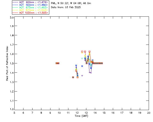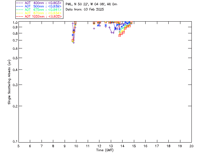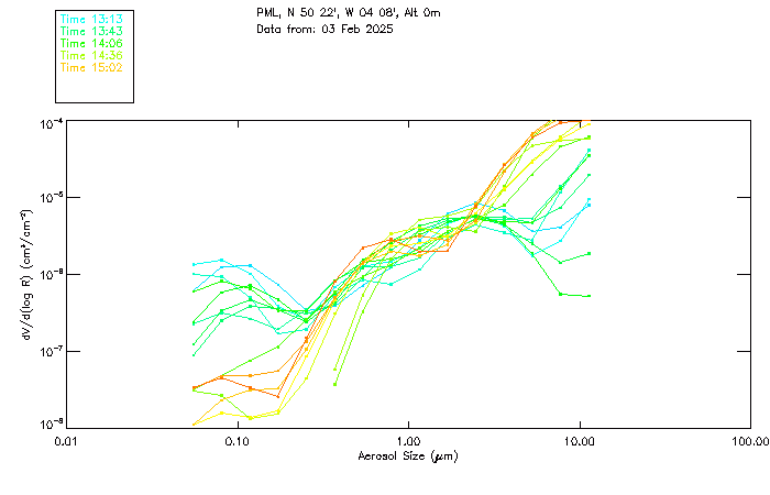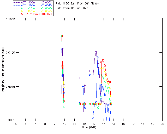 In May 2001 a PREDE POM01-L was installed on the roof of the Plymouth Marine Laboratory to continue the atmospheric correction research of the PML Remote Sensing Group. This was to replace the AERONET CIMEL sunphotometer situated at Rame Head which was decommissioned in 1999. The instrument operates at 7 wavelengths (315, 400, 500, 670, 870, 940 and 1020nm) and scans at pre-set angles away from the solar disk to determine, using the inversion code of Nakajima et al. (2006), various properties of tiny particles called aerosols within the atmospheric column. From these measurements useful atmospheric aerosol parameters such as the Aerosol Optical Thickness (AOT), aerosol size distribution and single scattering albedo can be calculated. Marine aerosols tend to be bigger (D > 1µm) than those generated over the land (0.01 < D < 1µm) and are of a different chemical composition; marine aerosols are salt particles whereas terrestrial aerosols are sulphate compounds.