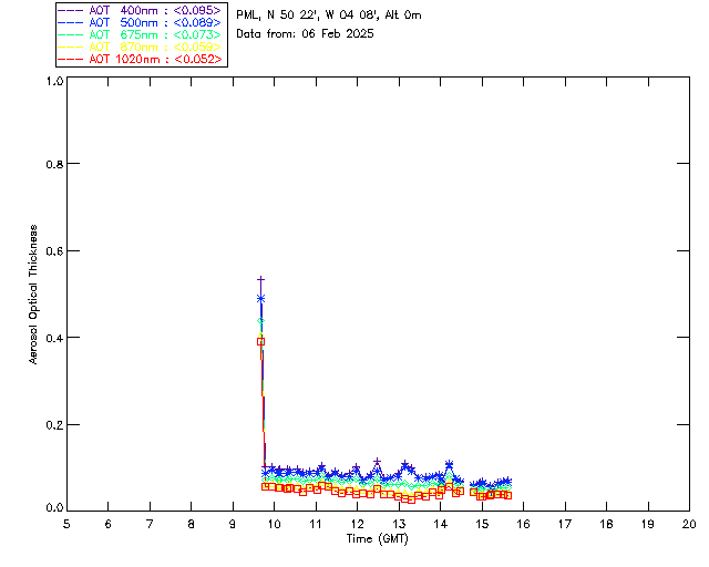 In May 2001 a PREDE POM01-L was installed on the roof of the Plymouth Marine Laboratory to continue the atmospheric correction research of the PML Remote Sensing Group. This was to replace the AERONET CIMEL sunphotometer situated at Rame Head which was decommissioned in 1999. The instrument operates at 7 wavelengths (315, 400, 500, 670, 870, 940 and 1020nm) and scans at pre-set angles away from the solar disk to determine, using the inversion code of Nakajima et al. (2006), various properties of tiny particles called aerosols within the atmospheric column. From these measurements useful atmospheric aerosol parameters such as the Aerosol Optical Thickness (AOT), aerosol size distribution and single scattering albedo can be calculated. Marine aerosols tend to be bigger (D > 1µm) than those generated over the land (0.01 < D < 1µm) and are of a different chemical composition; marine aerosols are salt particles whereas terrestrial aerosols are sulphate compounds.