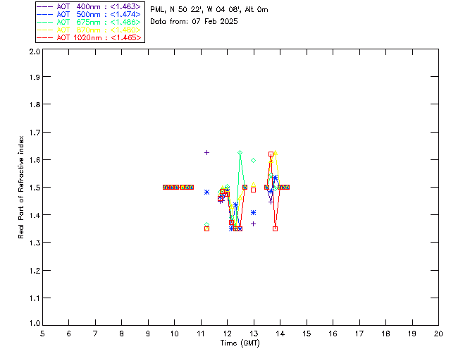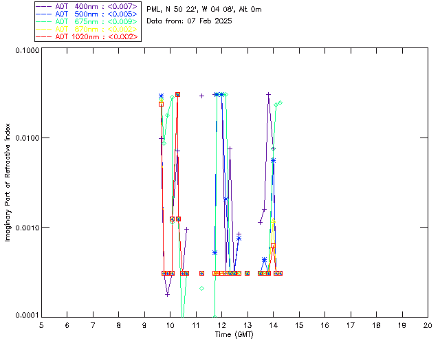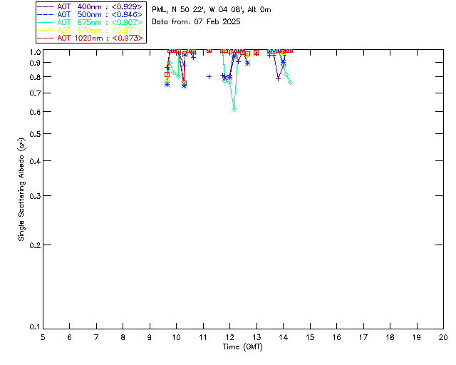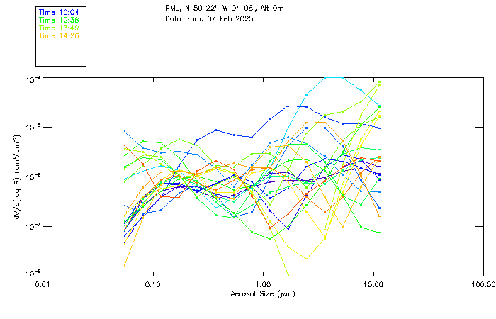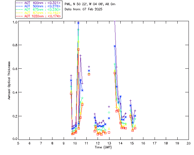 In May 2001 a PREDE POM01-L was installed on the roof of the Plymouth Marine Laboratory to continue the atmospheric correction research of the PML Remote Sensing Group. This was to replace the AERONET CIMEL sunphotometer situated at Rame Head which was decommissioned in 1999. The instrument operates at 7 wavelengths (315, 400, 500, 670, 870, 940 and 1020nm) and scans at pre-set angles away from the solar disk to determine, using the inversion code of Nakajima et al. (2006), various properties of tiny particles called aerosols within the atmospheric column. From these measurements useful atmospheric aerosol parameters such as the Aerosol Optical Thickness (AOT), aerosol size distribution and single scattering albedo can be calculated. Marine aerosols tend to be bigger (D > 1µm) than those generated over the land (0.01 < D < 1µm) and are of a different chemical composition; marine aerosols are salt particles whereas terrestrial aerosols are sulphate compounds.