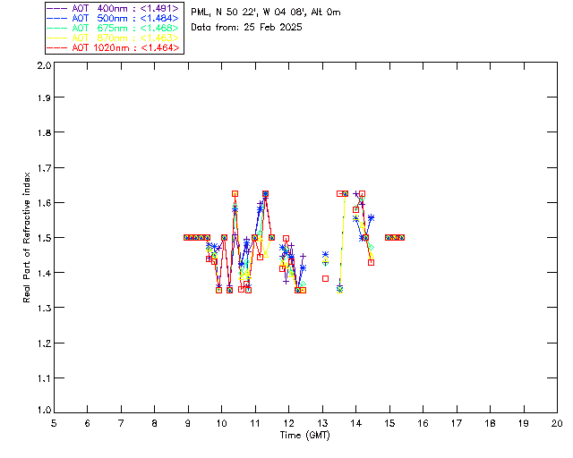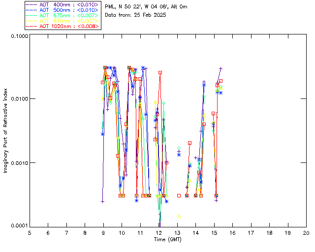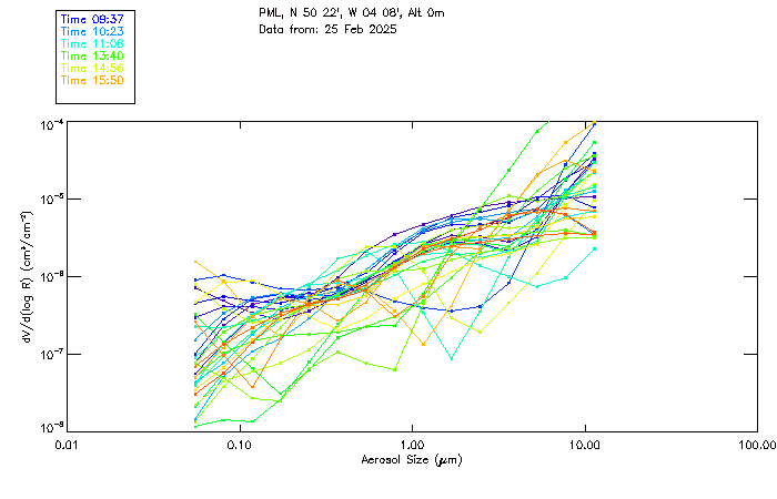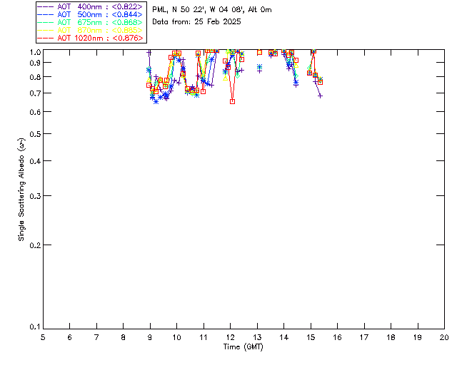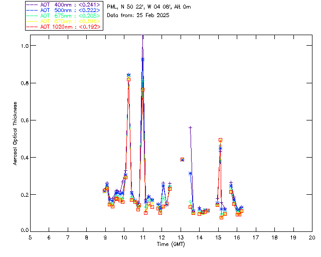 In May 2001 a PREDE POM01-L was installed on the roof of the Plymouth Marine Laboratory to continue the atmospheric correction research of the PML Remote Sensing Group. This was to replace the AERONET CIMEL sunphotometer situated at Rame Head which was decommissioned in 1999. The instrument operates at 7 wavelengths (315, 400, 500, 670, 870, 940 and 1020nm) and scans at pre-set angles away from the solar disk to determine, using the inversion code of Nakajima et al. (2006), various properties of tiny particles called aerosols within the atmospheric column. From these measurements useful atmospheric aerosol parameters such as the Aerosol Optical Thickness (AOT), aerosol size distribution and single scattering albedo can be calculated. Marine aerosols tend to be bigger (D > 1µm) than those generated over the land (0.01 < D < 1µm) and are of a different chemical composition; marine aerosols are salt particles whereas terrestrial aerosols are sulphate compounds.
