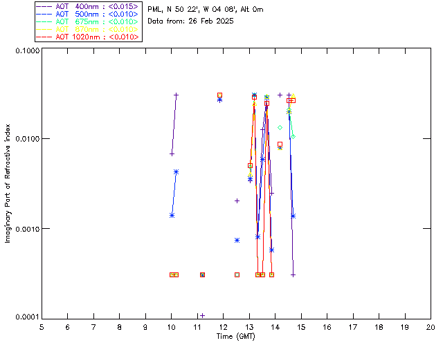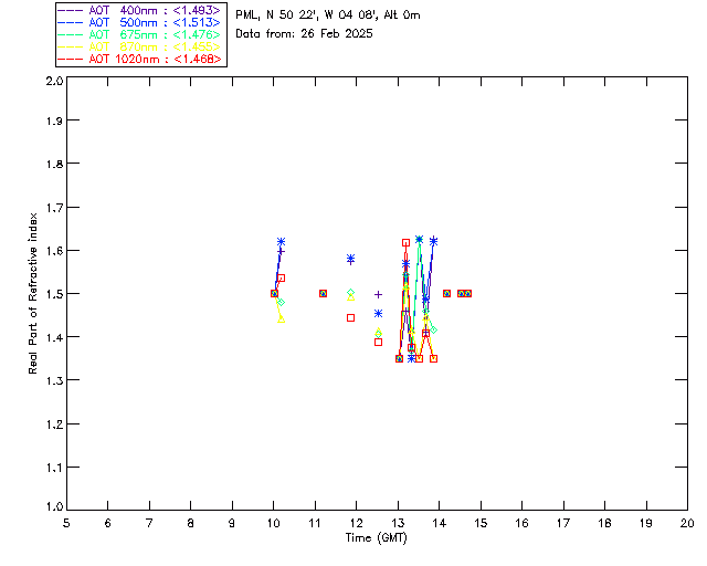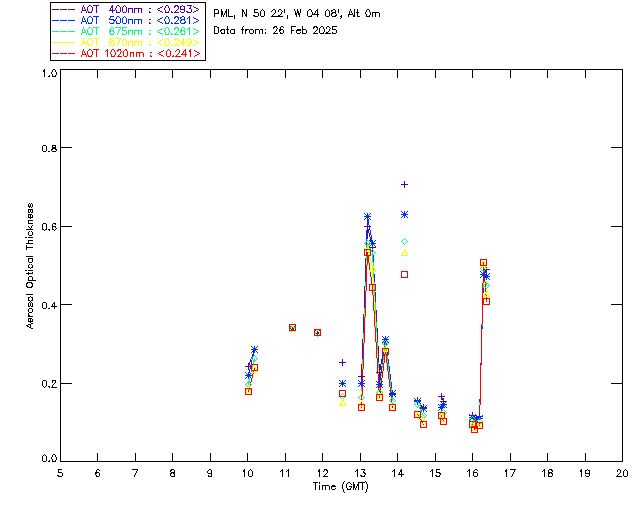 In May 2001 a PREDE POM01-L was installed on the roof of the Plymouth Marine Laboratory to continue the atmospheric correction research of the PML Remote Sensing Group. This was to replace the AERONET CIMEL sunphotometer situated at Rame Head which was decommissioned in 1999. The instrument operates at 7 wavelengths (315, 400, 500, 670, 870, 940 and 1020nm) and scans at pre-set angles away from the solar disk to determine, using the inversion code of Nakajima et al. (2006), various properties of tiny particles called aerosols within the atmospheric column. From these measurements useful atmospheric aerosol parameters such as the Aerosol Optical Thickness (AOT), aerosol size distribution and single scattering albedo can be calculated. Marine aerosols tend to be bigger (D > 1µm) than those generated over the land (0.01 < D < 1µm) and are of a different chemical composition; marine aerosols are salt particles whereas terrestrial aerosols are sulphate compounds.