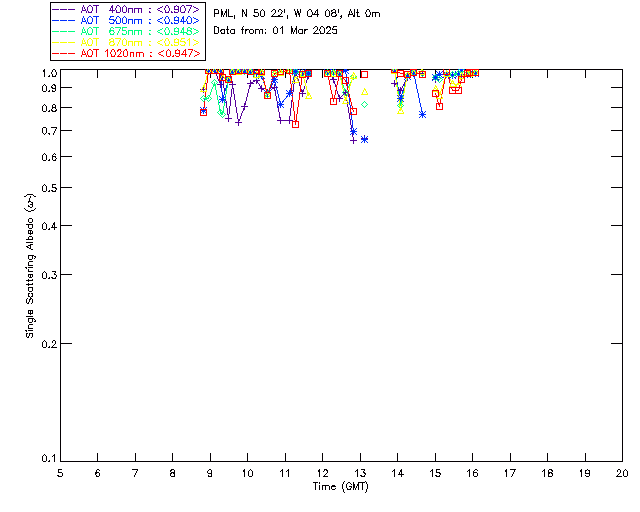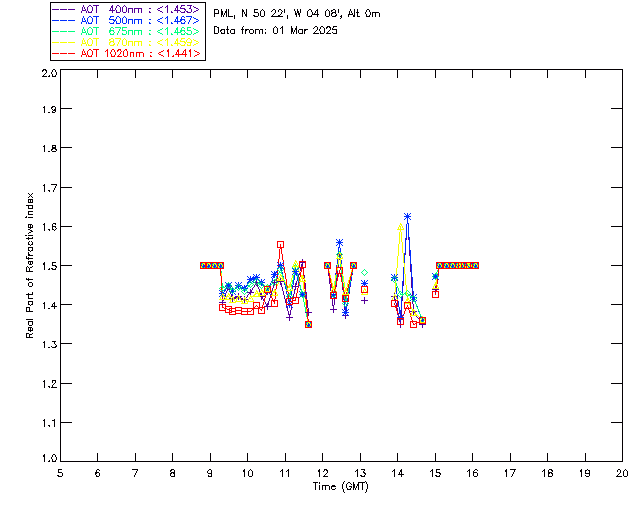 In May 2001 a PREDE POM01-L was installed on the roof of the Plymouth Marine Laboratory to continue the atmospheric correction research of the PML Remote Sensing Group. This was to replace the AERONET CIMEL sunphotometer situated at Rame Head which was decommissioned in 1999. The instrument operates at 7 wavelengths (315, 400, 500, 670, 870, 940 and 1020nm) and scans at pre-set angles away from the solar disk to determine, using the inversion code of Nakajima et al. (2006), various properties of tiny particles called aerosols within the atmospheric column. From these measurements useful atmospheric aerosol parameters such as the Aerosol Optical Thickness (AOT), aerosol size distribution and single scattering albedo can be calculated. Marine aerosols tend to be bigger (D > 1µm) than those generated over the land (0.01 < D < 1µm) and are of a different chemical composition; marine aerosols are salt particles whereas terrestrial aerosols are sulphate compounds.