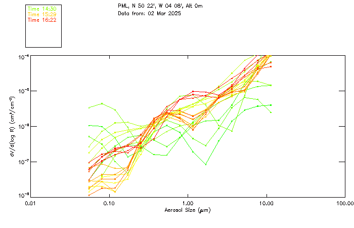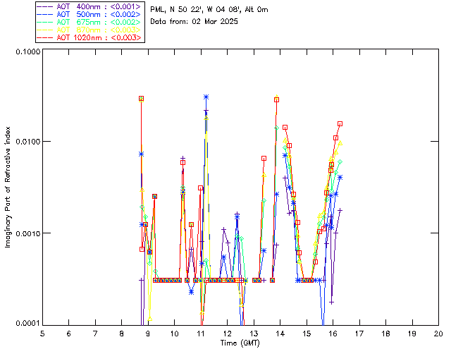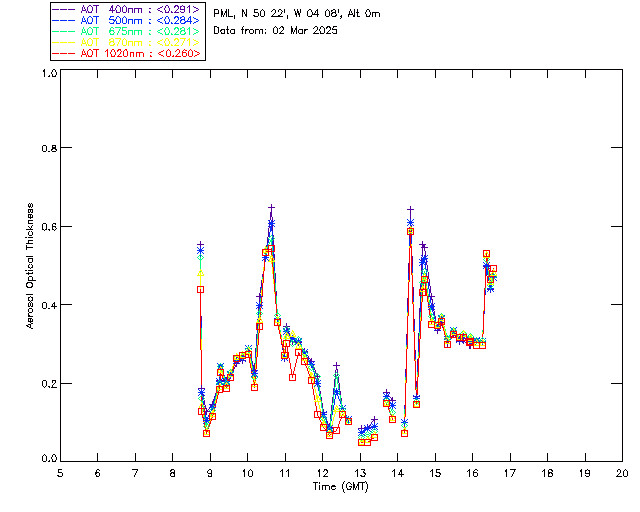 In May 2001 a PREDE POM01-L was installed on the roof of the Plymouth Marine Laboratory to continue the atmospheric correction research of the PML Remote Sensing Group. This was to replace the AERONET CIMEL sunphotometer situated at Rame Head which was decommissioned in 1999. The instrument operates at 7 wavelengths (315, 400, 500, 670, 870, 940 and 1020nm) and scans at pre-set angles away from the solar disk to determine, using the inversion code of Nakajima et al. (2006), various properties of tiny particles called aerosols within the atmospheric column. From these measurements useful atmospheric aerosol parameters such as the Aerosol Optical Thickness (AOT), aerosol size distribution and single scattering albedo can be calculated. Marine aerosols tend to be bigger (D > 1µm) than those generated over the land (0.01 < D < 1µm) and are of a different chemical composition; marine aerosols are salt particles whereas terrestrial aerosols are sulphate compounds.