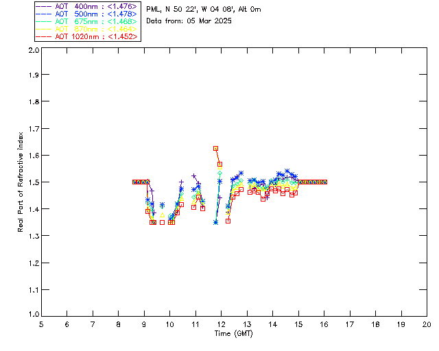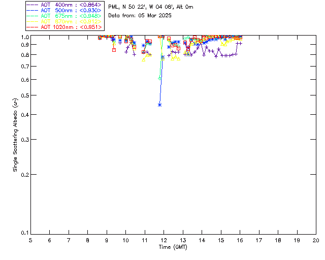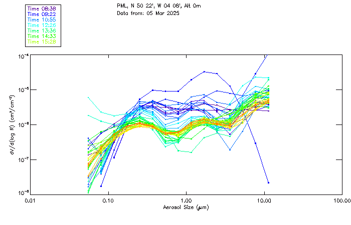 In May 2001 a PREDE POM01-L was installed on the roof of the Plymouth Marine Laboratory to continue the atmospheric correction research of the PML Remote Sensing Group. This was to replace the AERONET CIMEL sunphotometer situated at Rame Head which was decommissioned in 1999. The instrument operates at 7 wavelengths (315, 400, 500, 670, 870, 940 and 1020nm) and scans at pre-set angles away from the solar disk to determine, using the inversion code of Nakajima et al. (2006), various properties of tiny particles called aerosols within the atmospheric column. From these measurements useful atmospheric aerosol parameters such as the Aerosol Optical Thickness (AOT), aerosol size distribution and single scattering albedo can be calculated. Marine aerosols tend to be bigger (D > 1µm) than those generated over the land (0.01 < D < 1µm) and are of a different chemical composition; marine aerosols are salt particles whereas terrestrial aerosols are sulphate compounds.