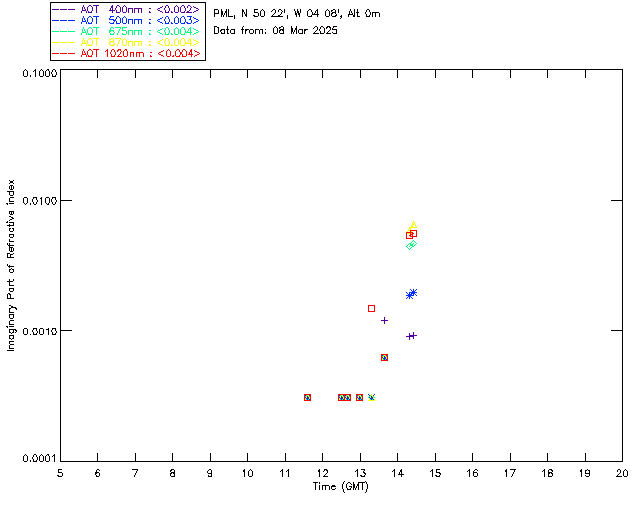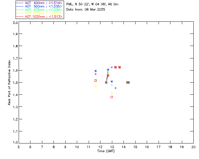 In May 2001 a PREDE POM01-L was installed on the roof of the Plymouth Marine Laboratory to continue the atmospheric correction research of the PML Remote Sensing Group. This was to replace the AERONET CIMEL sunphotometer situated at Rame Head which was decommissioned in 1999. The instrument operates at 7 wavelengths (315, 400, 500, 670, 870, 940 and 1020nm) and scans at pre-set angles away from the solar disk to determine, using the inversion code of Nakajima et al. (2006), various properties of tiny particles called aerosols within the atmospheric column. From these measurements useful atmospheric aerosol parameters such as the Aerosol Optical Thickness (AOT), aerosol size distribution and single scattering albedo can be calculated. Marine aerosols tend to be bigger (D > 1µm) than those generated over the land (0.01 < D < 1µm) and are of a different chemical composition; marine aerosols are salt particles whereas terrestrial aerosols are sulphate compounds.