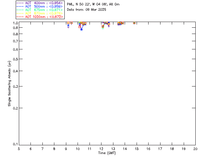 In May 2001 a PREDE POM01-L was installed on the roof of the Plymouth Marine Laboratory to continue the atmospheric correction research of the PML Remote Sensing Group. This was to replace the AERONET CIMEL sunphotometer situated at Rame Head which was decommissioned in 1999. The instrument operates at 7 wavelengths (315, 400, 500, 670, 870, 940 and 1020nm) and scans at pre-set angles away from the solar disk to determine, using the inversion code of Nakajima et al. (2006), various properties of tiny particles called aerosols within the atmospheric column. From these measurements useful atmospheric aerosol parameters such as the Aerosol Optical Thickness (AOT), aerosol size distribution and single scattering albedo can be calculated. Marine aerosols tend to be bigger (D > 1µm) than those generated over the land (0.01 < D < 1µm) and are of a different chemical composition; marine aerosols are salt particles whereas terrestrial aerosols are sulphate compounds.