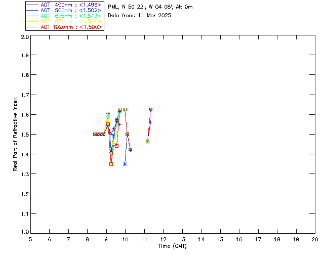 In May 2001 a PREDE POM01-L was installed on the roof of the Plymouth Marine Laboratory to continue the atmospheric correction research of the PML Remote Sensing Group. This was to replace the AERONET CIMEL sunphotometer situated at Rame Head which was decommissioned in 1999. The instrument operates at 7 wavelengths (315, 400, 500, 670, 870, 940 and 1020nm) and scans at pre-set angles away from the solar disk to determine, using the inversion code of Nakajima et al. (2006), various properties of tiny particles called aerosols within the atmospheric column. From these measurements useful atmospheric aerosol parameters such as the Aerosol Optical Thickness (AOT), aerosol size distribution and single scattering albedo can be calculated. Marine aerosols tend to be bigger (D > 1µm) than those generated over the land (0.01 < D < 1µm) and are of a different chemical composition; marine aerosols are salt particles whereas terrestrial aerosols are sulphate compounds.