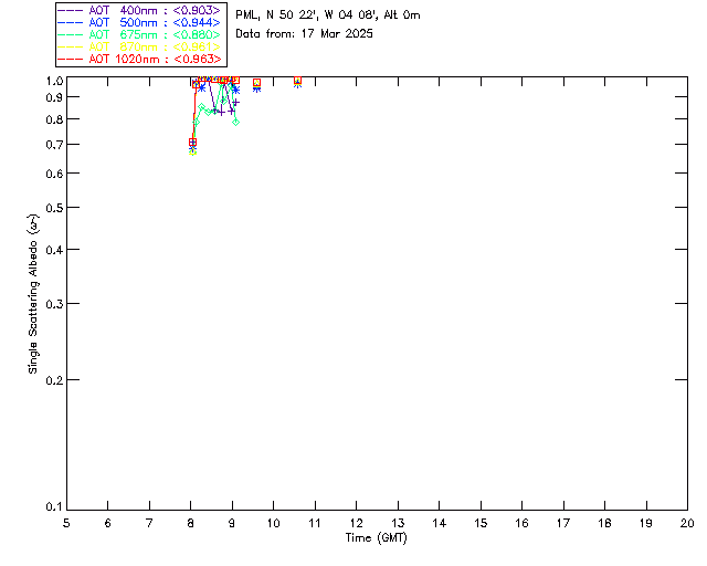 In May 2001 a PREDE POM01-L was installed on the roof of the Plymouth Marine Laboratory to continue the atmospheric correction research of the PML Remote Sensing Group. This was to replace the AERONET CIMEL sunphotometer situated at Rame Head which was decommissioned in 1999. The instrument operates at 7 wavelengths (315, 400, 500, 670, 870, 940 and 1020nm) and scans at pre-set angles away from the solar disk to determine, using the inversion code of Nakajima et al. (2006), various properties of tiny particles called aerosols within the atmospheric column. From these measurements useful atmospheric aerosol parameters such as the Aerosol Optical Thickness (AOT), aerosol size distribution and single scattering albedo can be calculated. Marine aerosols tend to be bigger (D > 1µm) than those generated over the land (0.01 < D < 1µm) and are of a different chemical composition; marine aerosols are salt particles whereas terrestrial aerosols are sulphate compounds.