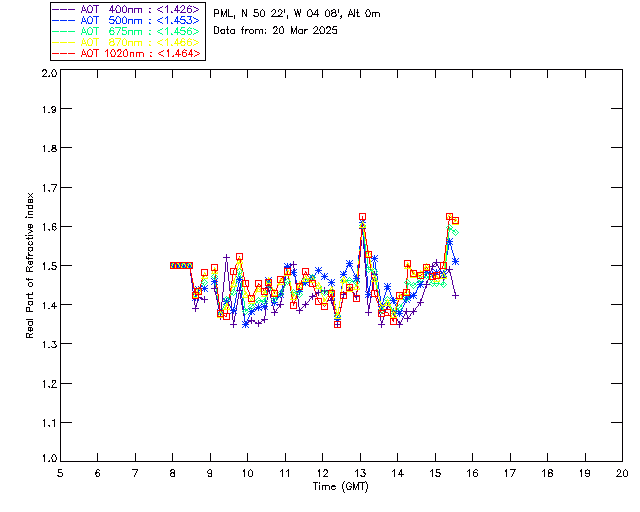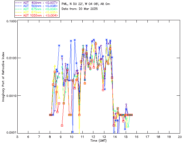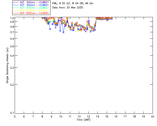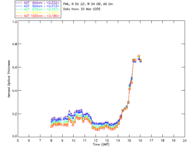 In May 2001 a PREDE POM01-L was installed on the roof of the Plymouth Marine Laboratory to continue the atmospheric correction research of the PML Remote Sensing Group. This was to replace the AERONET CIMEL sunphotometer situated at Rame Head which was decommissioned in 1999. The instrument operates at 7 wavelengths (315, 400, 500, 670, 870, 940 and 1020nm) and scans at pre-set angles away from the solar disk to determine, using the inversion code of Nakajima et al. (2006), various properties of tiny particles called aerosols within the atmospheric column. From these measurements useful atmospheric aerosol parameters such as the Aerosol Optical Thickness (AOT), aerosol size distribution and single scattering albedo can be calculated. Marine aerosols tend to be bigger (D > 1µm) than those generated over the land (0.01 < D < 1µm) and are of a different chemical composition; marine aerosols are salt particles whereas terrestrial aerosols are sulphate compounds.