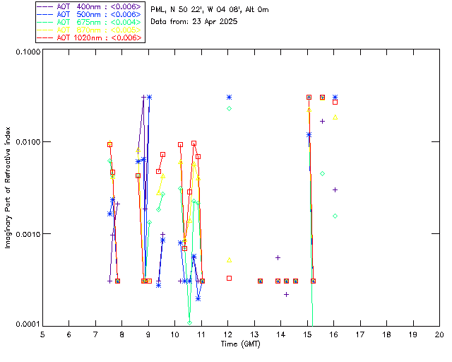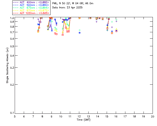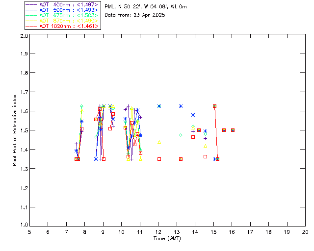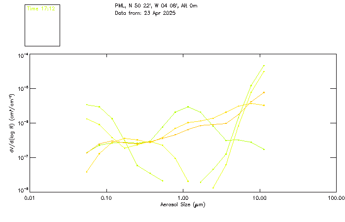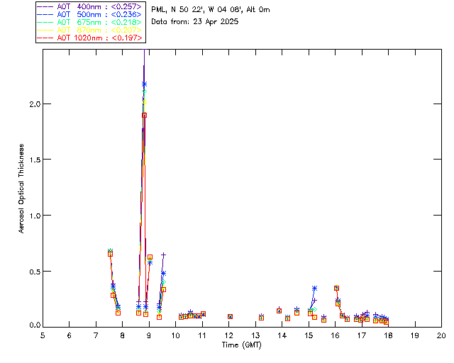 In May 2001 a PREDE POM01-L was installed on the roof of the Plymouth Marine Laboratory to continue the atmospheric correction research of the PML Remote Sensing Group. This was to replace the AERONET CIMEL sunphotometer situated at Rame Head which was decommissioned in 1999. The instrument operates at 7 wavelengths (315, 400, 500, 670, 870, 940 and 1020nm) and scans at pre-set angles away from the solar disk to determine, using the inversion code of Nakajima et al. (2006), various properties of tiny particles called aerosols within the atmospheric column. From these measurements useful atmospheric aerosol parameters such as the Aerosol Optical Thickness (AOT), aerosol size distribution and single scattering albedo can be calculated. Marine aerosols tend to be bigger (D > 1µm) than those generated over the land (0.01 < D < 1µm) and are of a different chemical composition; marine aerosols are salt particles whereas terrestrial aerosols are sulphate compounds.