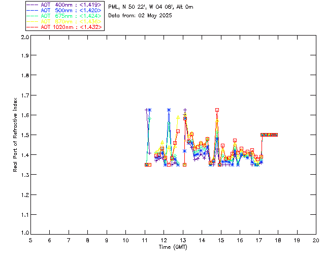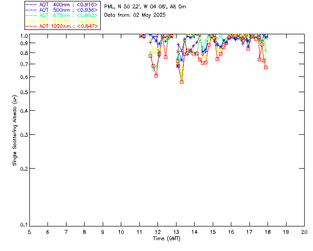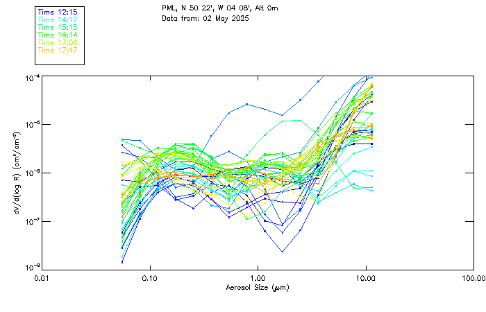 In May 2001 a PREDE POM01-L was installed on the roof of the Plymouth Marine Laboratory to continue the atmospheric correction research of the PML Remote Sensing Group. This was to replace the AERONET CIMEL sunphotometer situated at Rame Head which was decommissioned in 1999. The instrument operates at 7 wavelengths (315, 400, 500, 670, 870, 940 and 1020nm) and scans at pre-set angles away from the solar disk to determine, using the inversion code of Nakajima et al. (2006), various properties of tiny particles called aerosols within the atmospheric column. From these measurements useful atmospheric aerosol parameters such as the Aerosol Optical Thickness (AOT), aerosol size distribution and single scattering albedo can be calculated. Marine aerosols tend to be bigger (D > 1µm) than those generated over the land (0.01 < D < 1µm) and are of a different chemical composition; marine aerosols are salt particles whereas terrestrial aerosols are sulphate compounds.